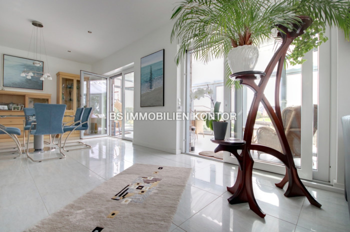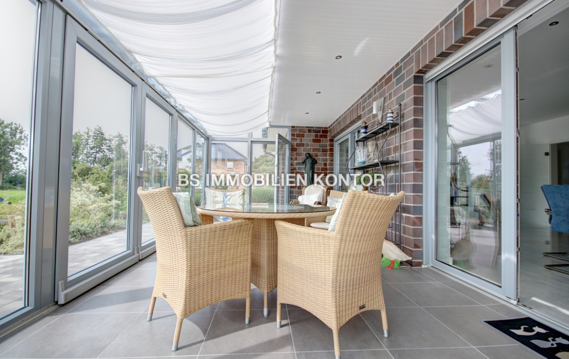EG: Flur/Diele, offener Wohn-/Essbereich, Wintergarten, Küche, Schlafzimmer, Bad, Gäste WC, Hauswirtschaftsraum