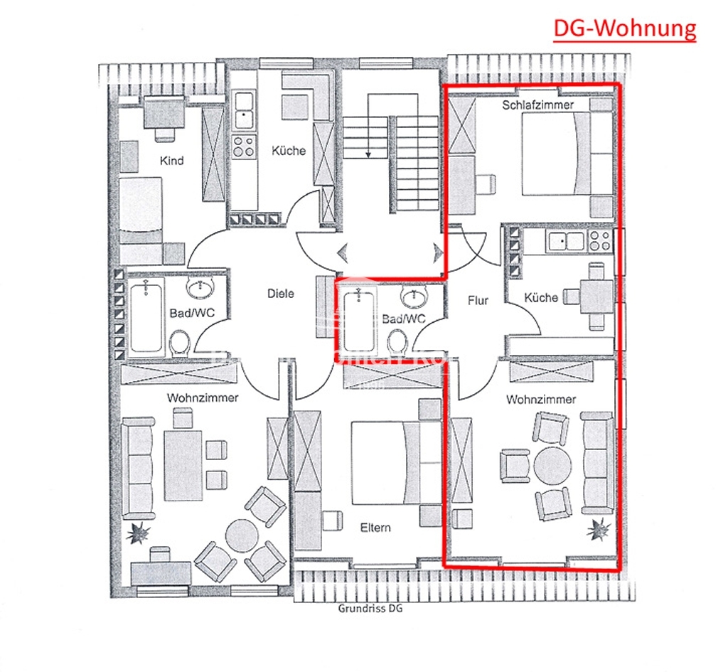 Wohnung – DG: Flur/Diele, Schlafzimmer, Küche mit gepflegter EBK, Duschbad mit WC, Wohnzimmer, Kellerraum u. Waschküche