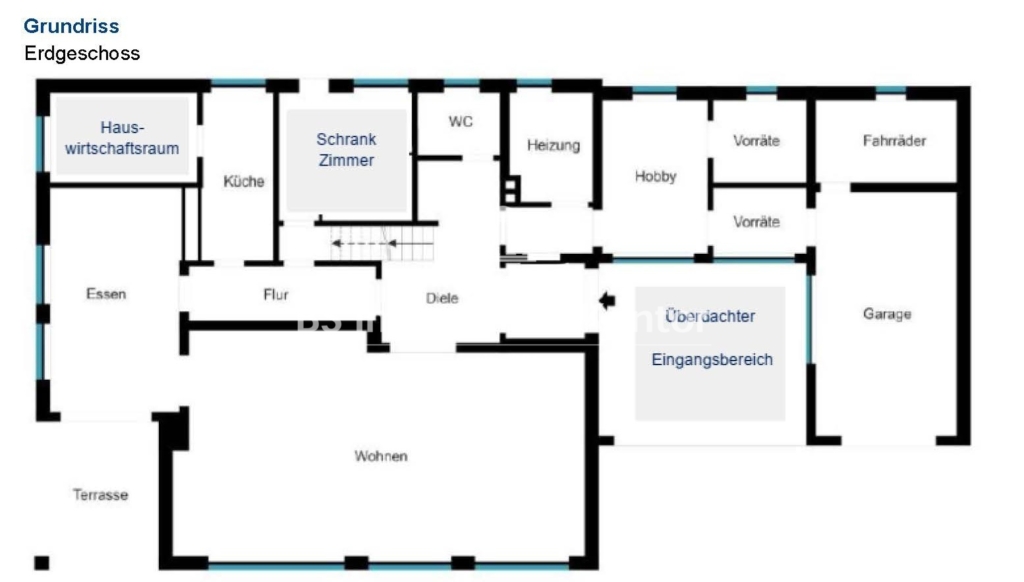 EG: Flur/Diele, großer, offener Wohnbereich mit Kamin, Esszimmer, Küche, Gäste-WC, Schrankzimmer, Technikraum, Werkstatt, Flur Garage, Lager