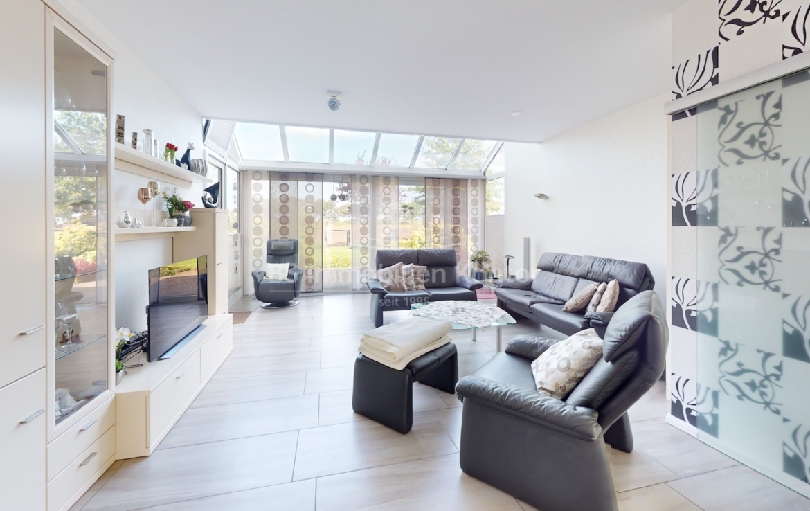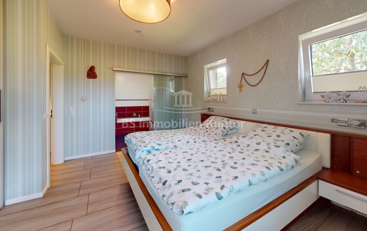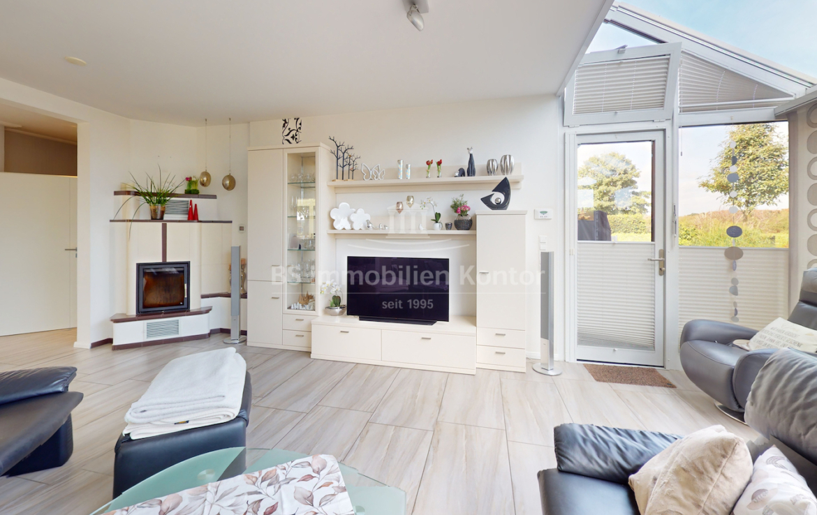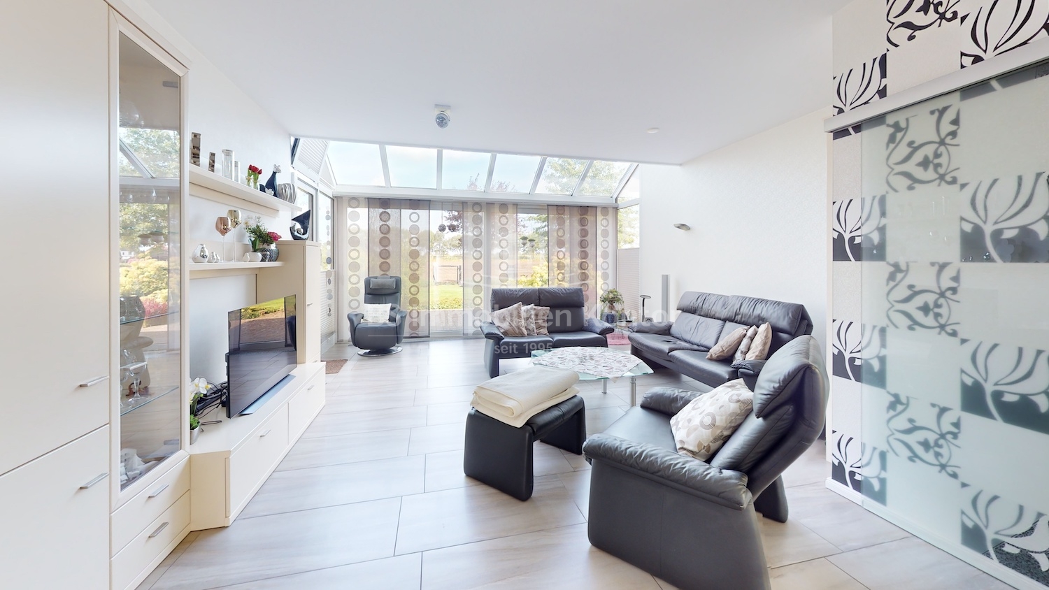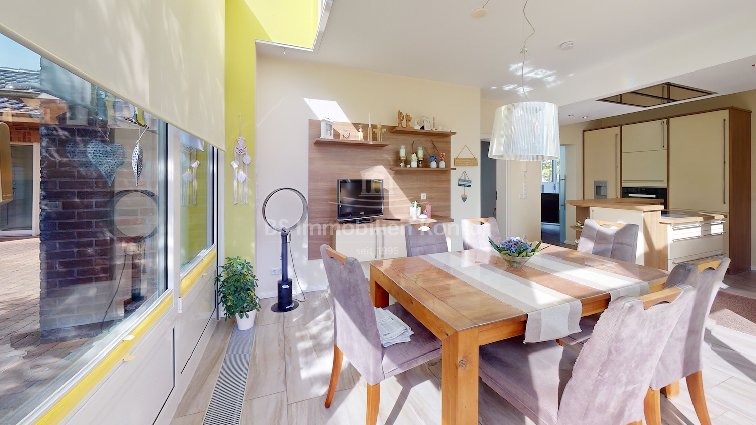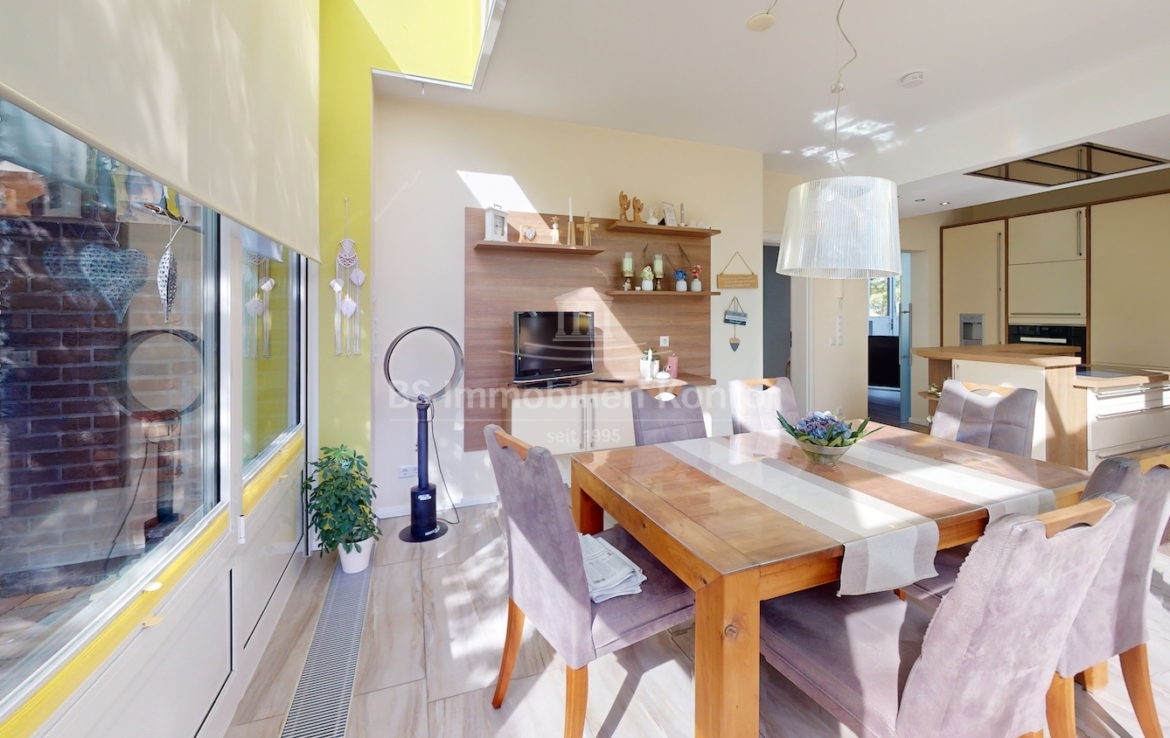 Der offene Küchen- und Essbereich (inkl. moderner Einbauküche) bildet zusammen mit dem integrierten Wintergarten das Herzstück des Hauses. Hier genießen Sie viel Platz für gemeinsame Mahlzeiten und einen direkten Zugang zur Terrasse, die zum Entspannen im Freien einlädt. Eine elegante Schiebetür verbindet den Essbereich mit dem lichtdurchfluteten Wohnzimmer, dessen bodentiefe Fenster eine helle und freundliche Atmosphäre schaffen. Praktisch ergänzt wird diese Ebene durch einen Hauswirtschaftsraum, ein Gäste-WC sowie ein großzügiges Schlafzimmer mit begehbarem Kleiderschrank und direktem Zugang zu einem komfortablen Badezimmer.