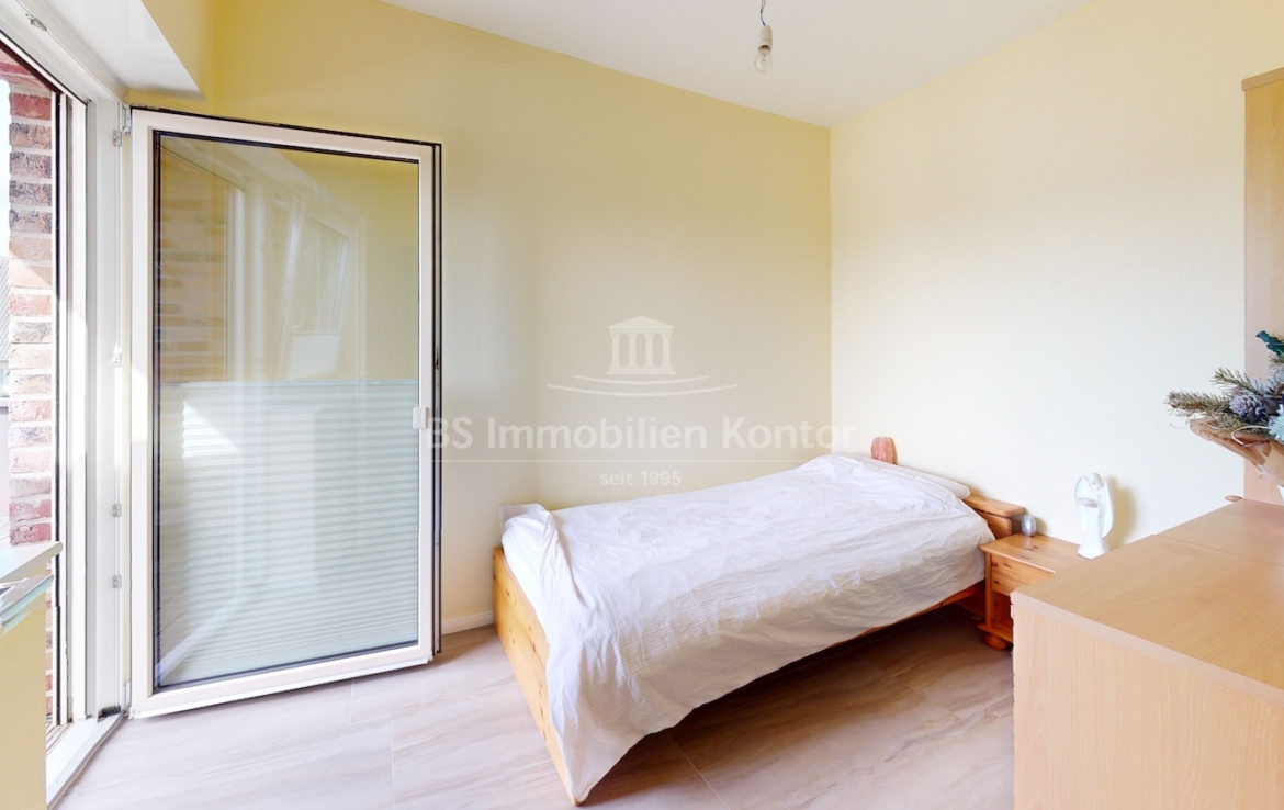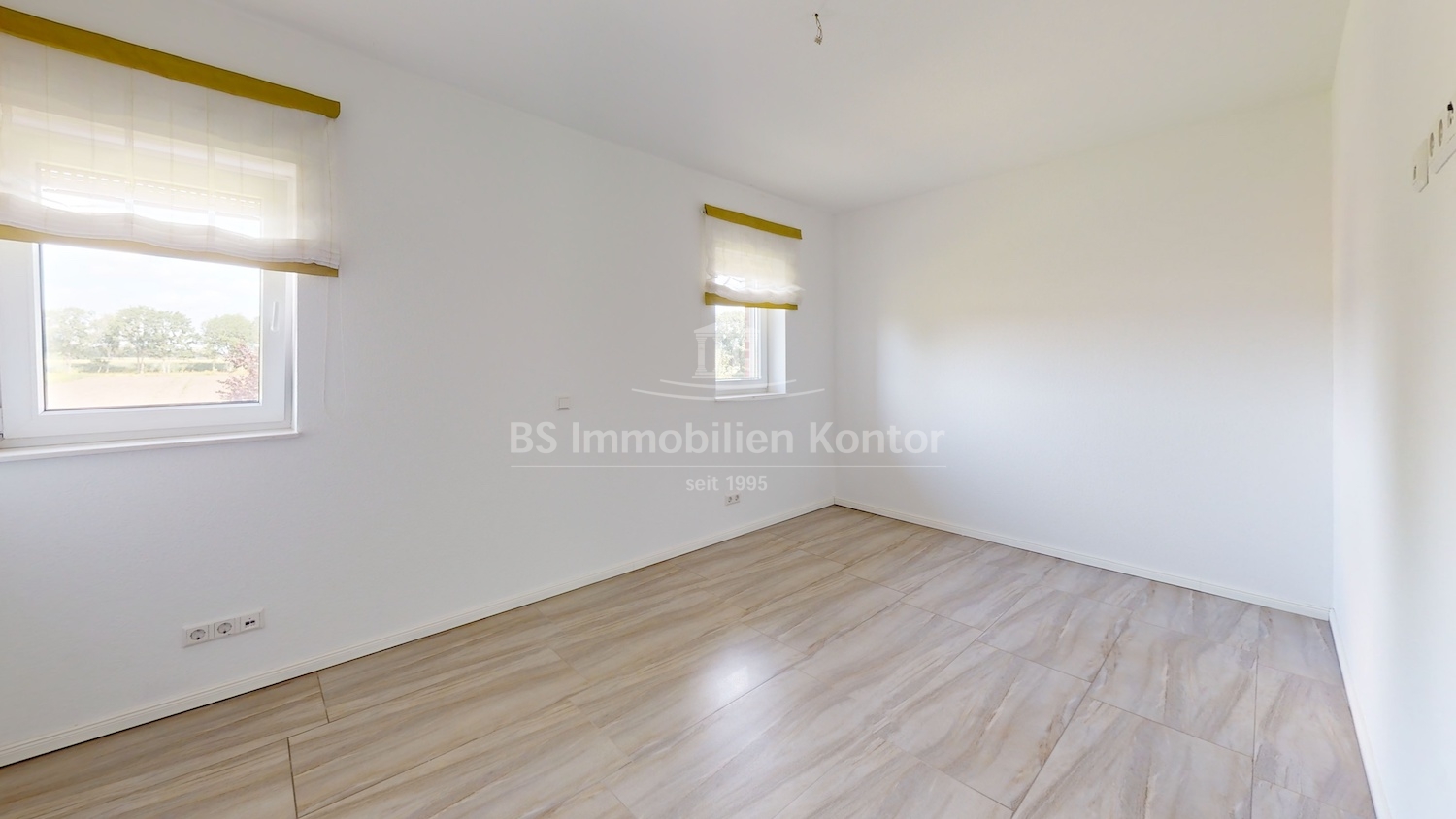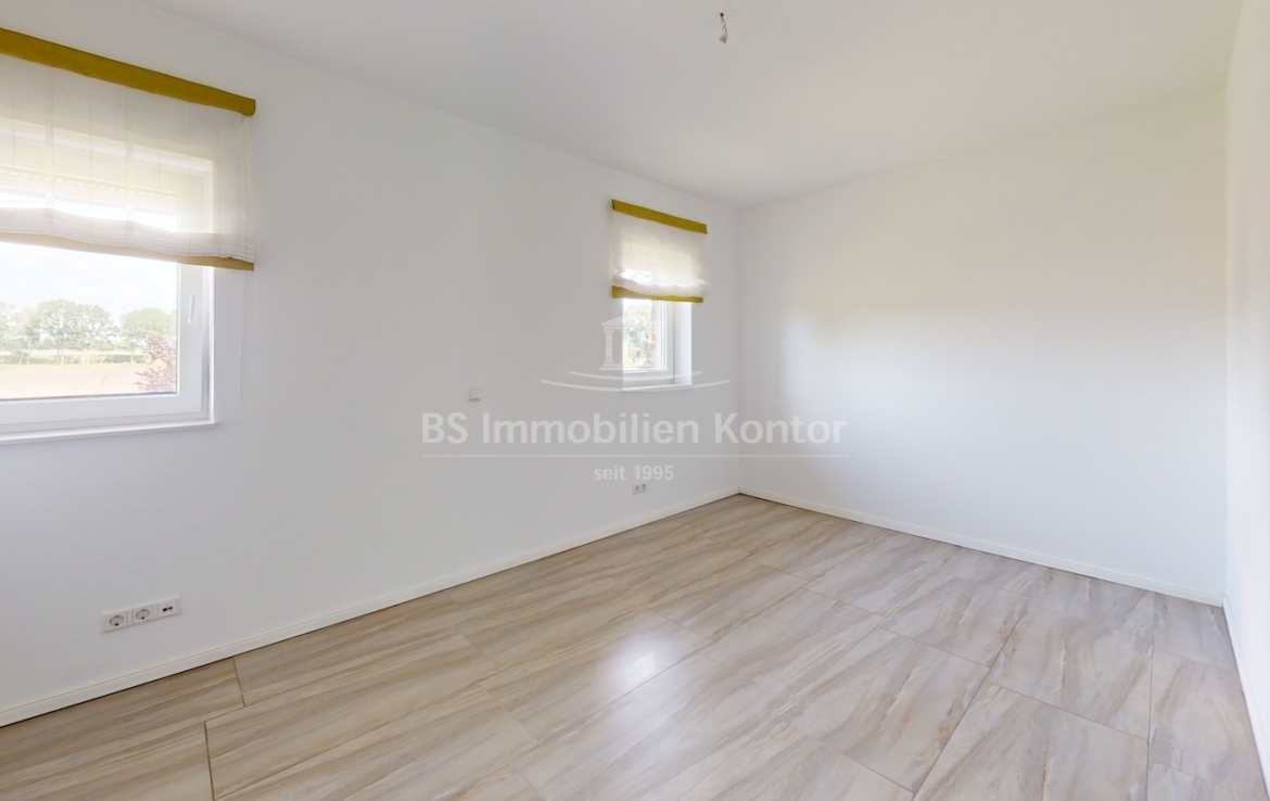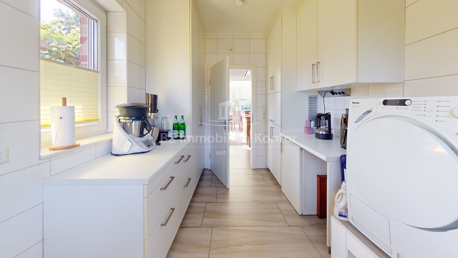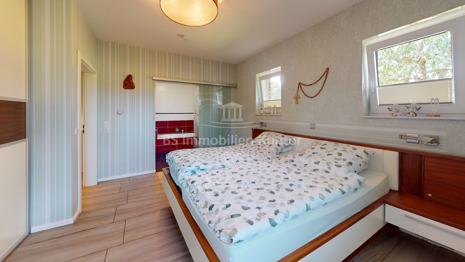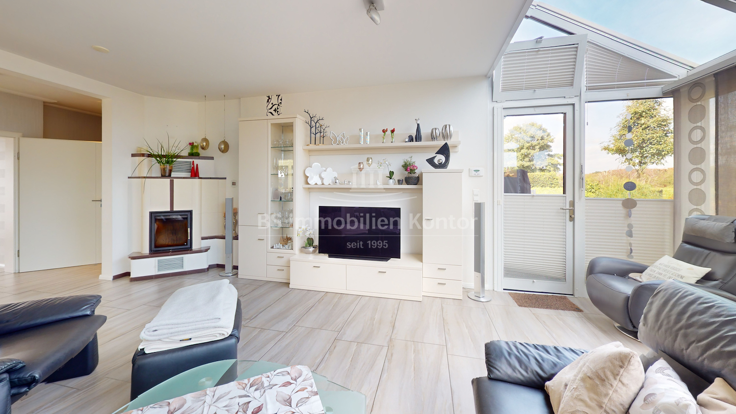 Der offene Küchen- und Essbereich (inkl. moderner Einbauküche) bildet zusammen mit dem integrierten Wintergarten das Herzstück des Hauses. Hier genießen Sie viel Platz für gemeinsame Mahlzeiten und einen direkten Zugang zur Terrasse, die zum Entspannen im Freien einlädt. Eine elegante Schiebetür verbindet den Essbereich mit dem lichtdurchfluteten Wohnzimmer, dessen bodentiefe Fenster eine helle und freundliche Atmosphäre schaffen. Praktisch ergänzt wird diese Ebene durch einen Hauswirtschaftsraum, ein Gäste-WC sowie ein großzügiges Schlafzimmer mit begehbarem Kleiderschrank und direktem Zugang zu einem komfortablen Badezimmer.