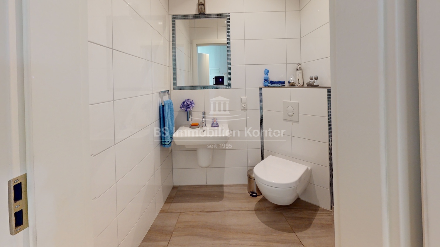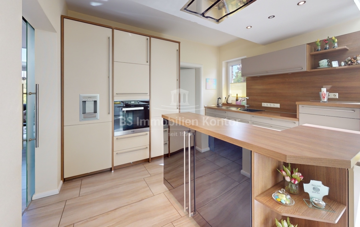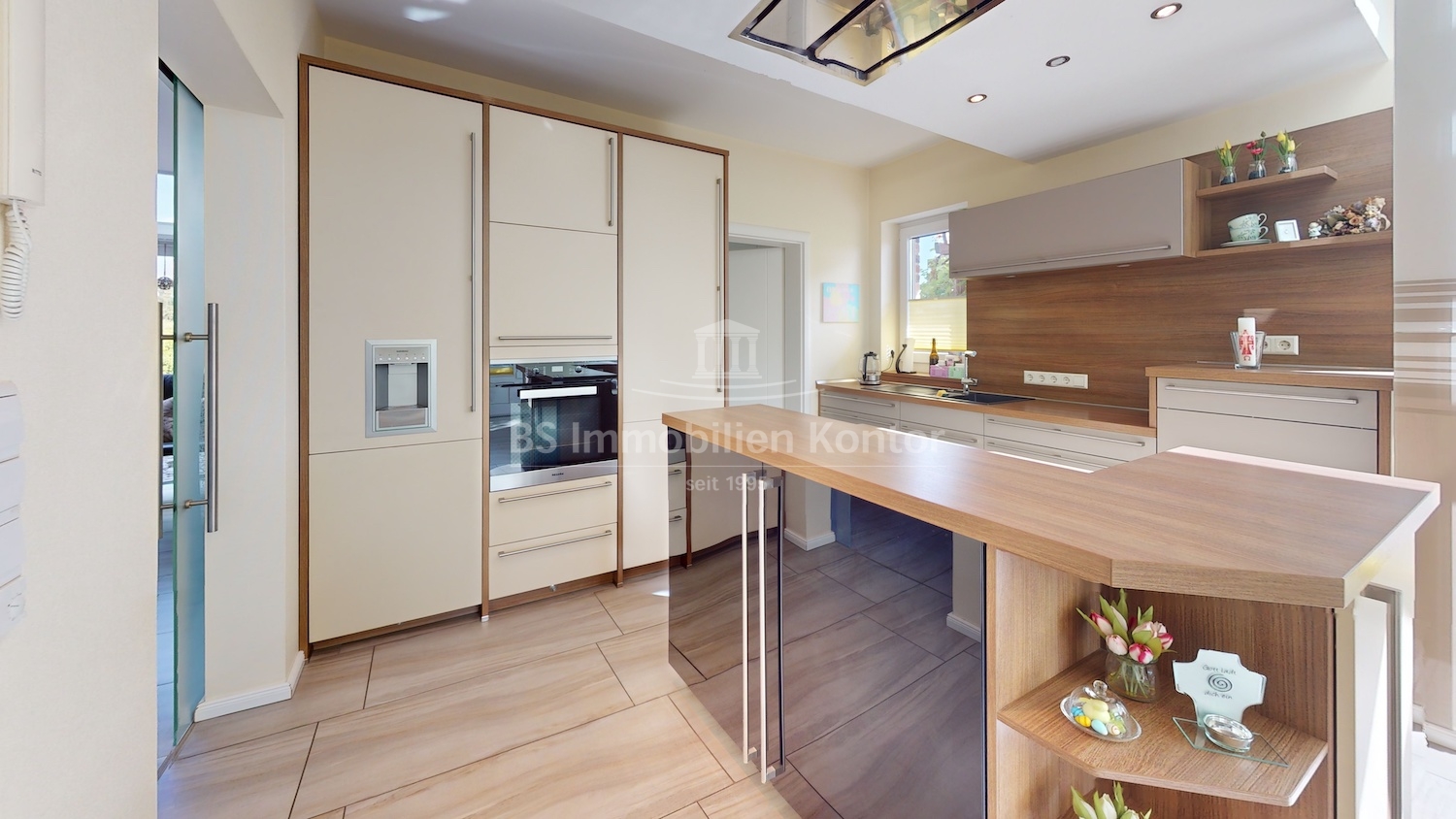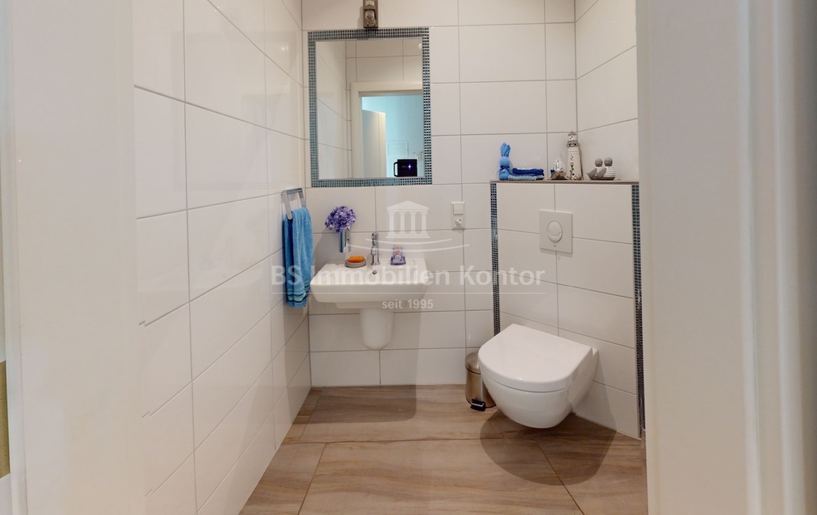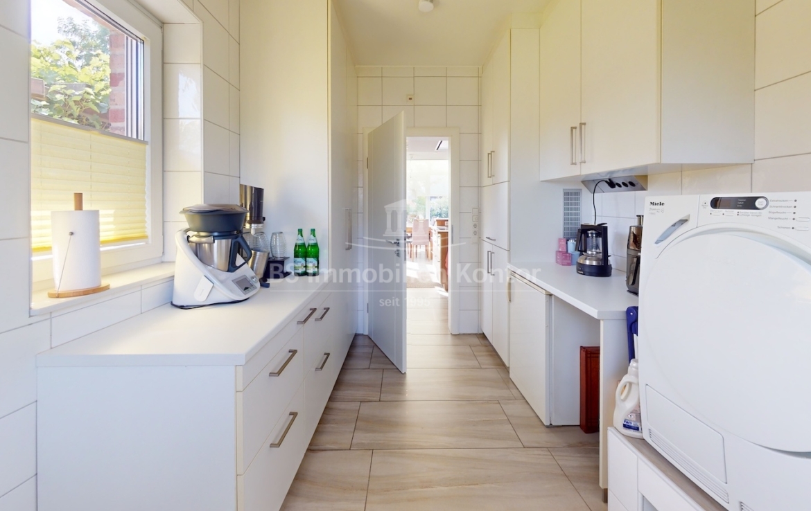 Ein weiteres Highlight ist der eigenständige Bürotrakt mit separatem Eingang und eigenem Gäste-WC – perfekt für Architekten, Finanzdienstleister oder für das Homeoffice. Über einen Flur gelangen Sie direkt in die geflieste, beheizte Doppelgarage, die mit einer Fußbodenheizung ausgestattet ist.