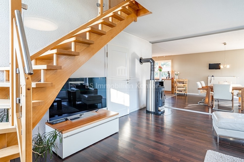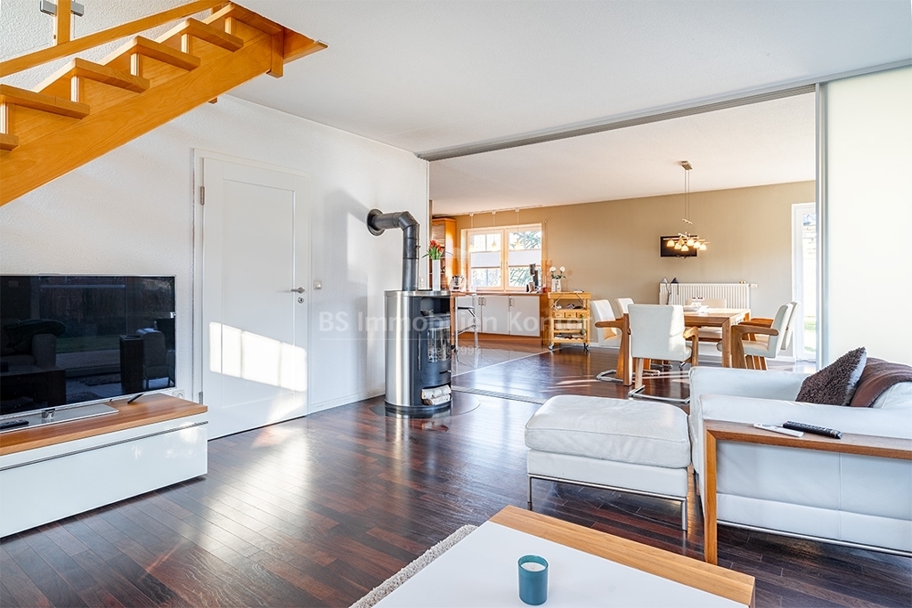 -Kaminofen im Wohnzimmer, elektrische Jalousien im Wohnzimmer