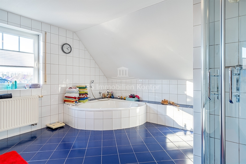OG: Flur/Diele, gr. Vollbad, Elternschlafzimmer mit Ankleide, Kinderzimmer mit Zugang zum Dachboden, Büro, Heizungsraum