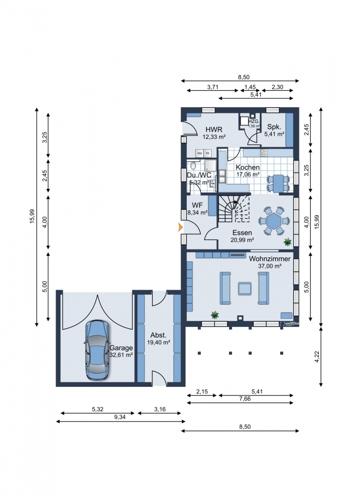 Gebäude:EG:Windfang, Gäste-WC mit Dusche, HWR mit zus. sep. Außentür, Heizungsraum, Speisekammer, offener Wohn-/Essbereich mit Galerie und vergl. Erker, Wohnküche, Wohnzimmer mit Kaminofen u. Zugang zur Terrasse