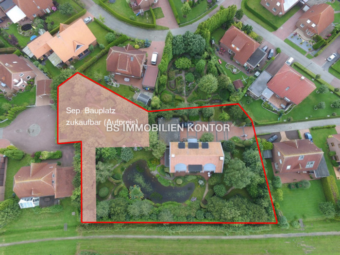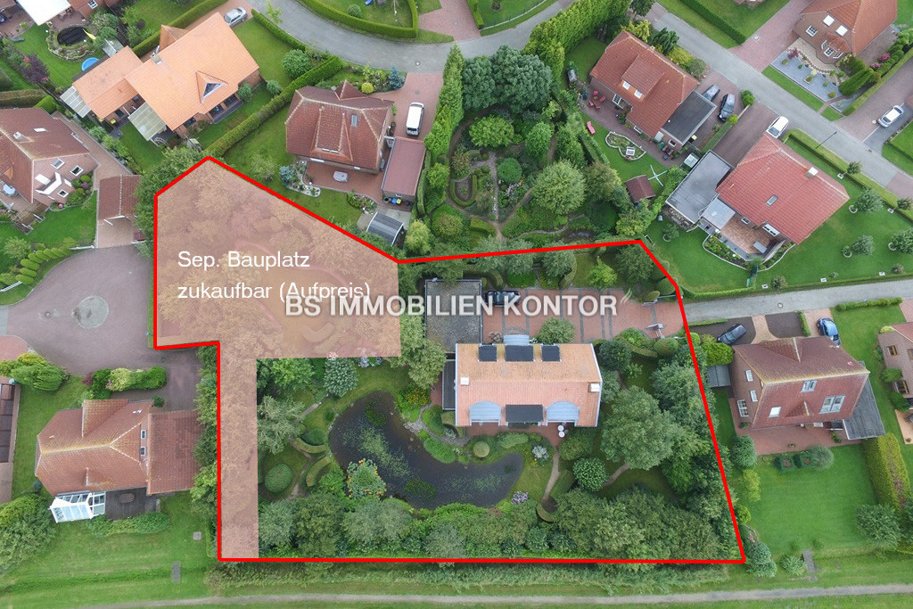 Grundstüca. 1.931 qm (Gartenanlage mit Teich, D-Garage, Bauplatz zukaufbar rot schraffiert, Teichanlage, eingefriedete Gartenanlage, Hofauffahrt mit elektr. Toranlage, alter Baumbestand, parkähnliche Gartenanlage)