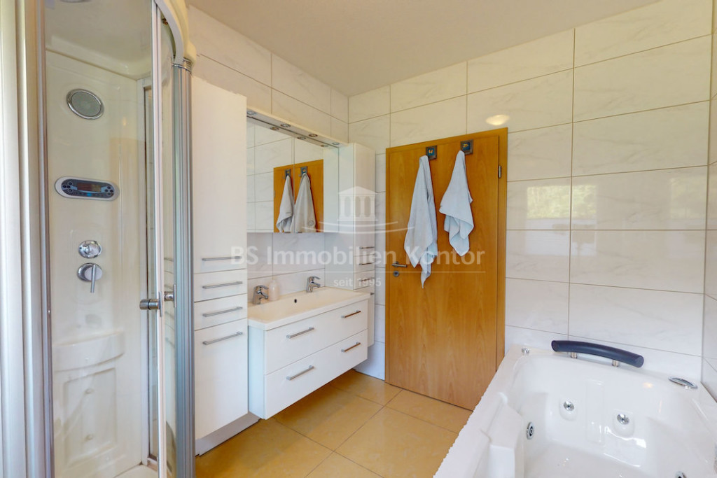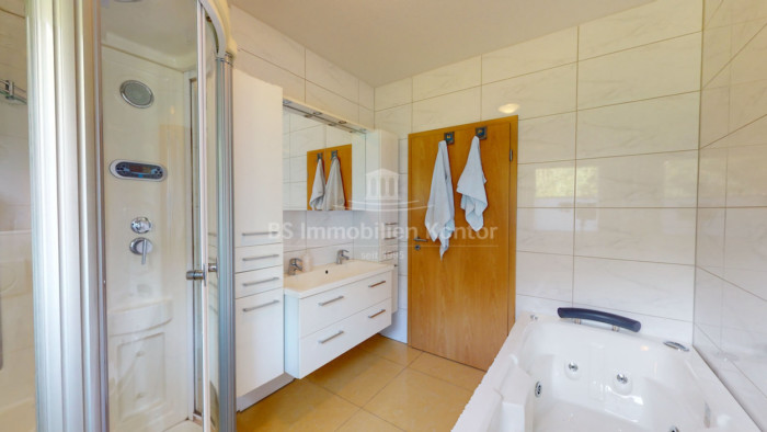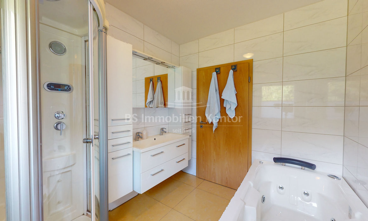 EG: Flur/Diele, Wohn-/Koch-/Essbereich, Elternschlafzimmer, Vollbad (mit Whirlpool und Massagedusche), HWR mit Zugang zur Garage