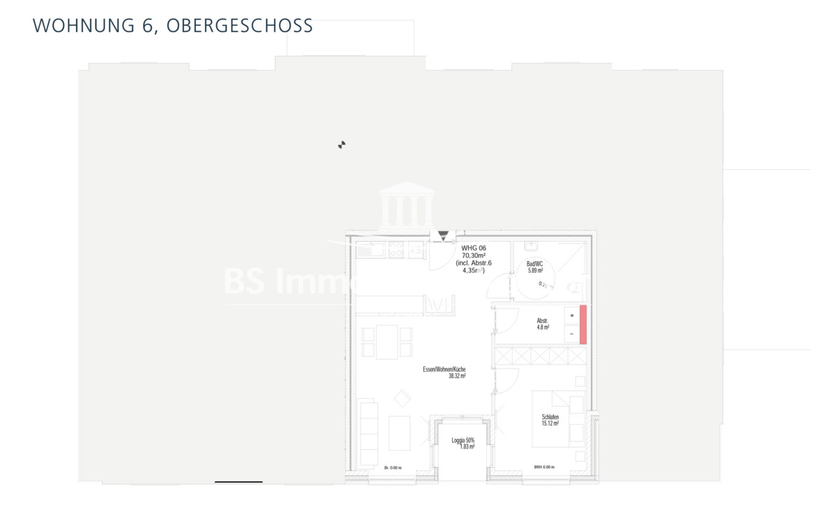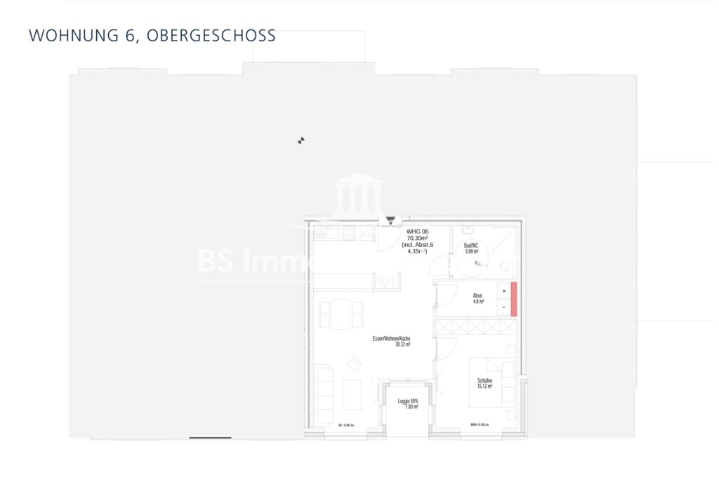 EG: Flur/Diele, Schlafzimmer, Duschbad mit WC, Abstellraum, offener Wohn-/Essbereich mit Küche, Loggia