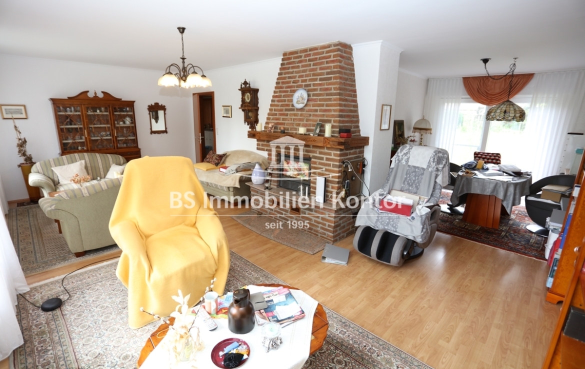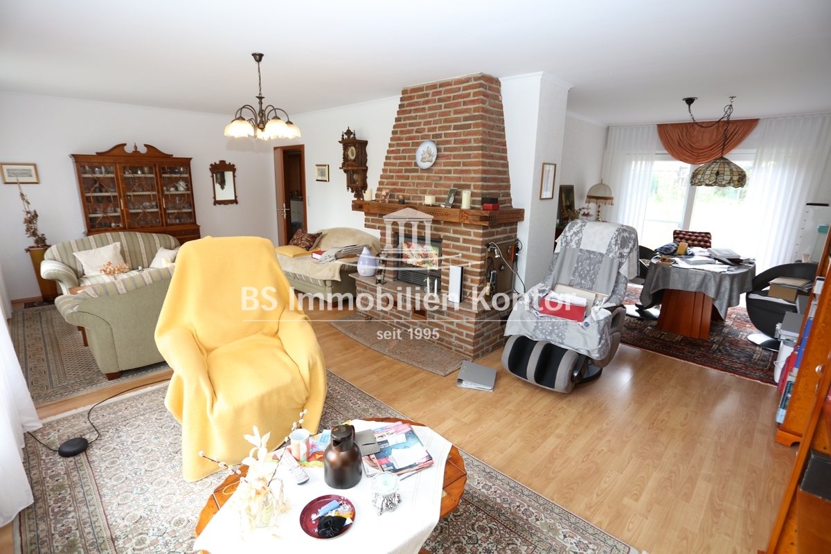 EG: Flur/Diele, Küche, offener Wohn-/Essbereich mit Kamin und Zugang zur Terrasse, Gäste-WC, HWR, zzgl. Kellerräume