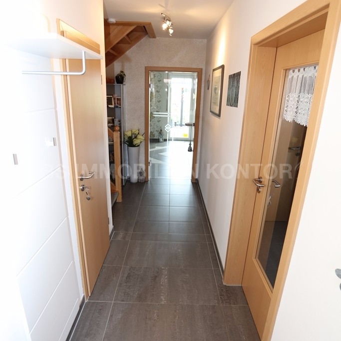 EG:Flur/Diele, Wohnküche, HWR/Heizungsraum, Gäste-WC, Abstellraum, Wohnzimmer mit Zugang zur Terrasse, Garage (7×4 m) mit elektrischem Sectionaltor