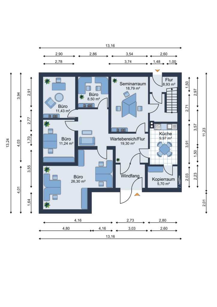 EG: Windfang/Eingangsbereich, großzügiger Wartebereich, Küche, Kopierraum, großes Büro, Seminarraum, 3x Büroraum;