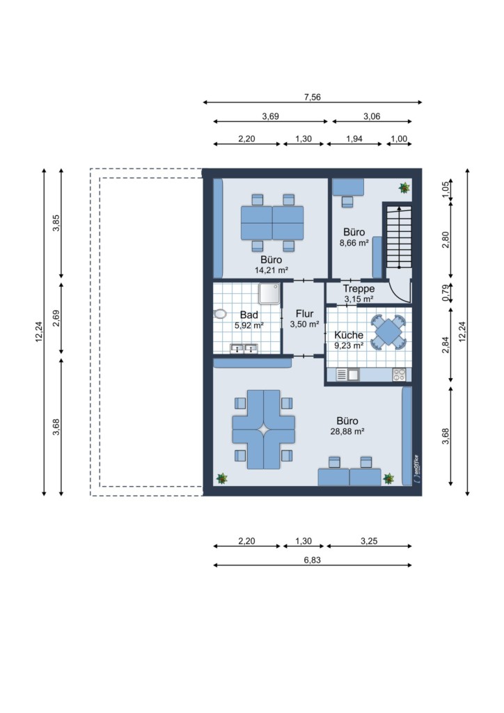 1. OG: Flur/Diele, großes Büro, Bad, Küche, 2x Büroraum ; Fläche ca. 74 qm