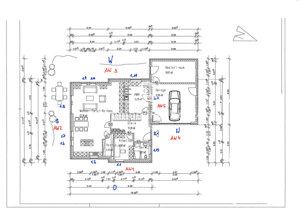 Gebäude: EG: Flur/Diele, Duschbad mit WC, Büro, offener Wohn-/Essbereich mit Küche und Zugang zum Sommergarten, Vorratsraum, HWR mit Durchgang z. Garage, Abstellraum