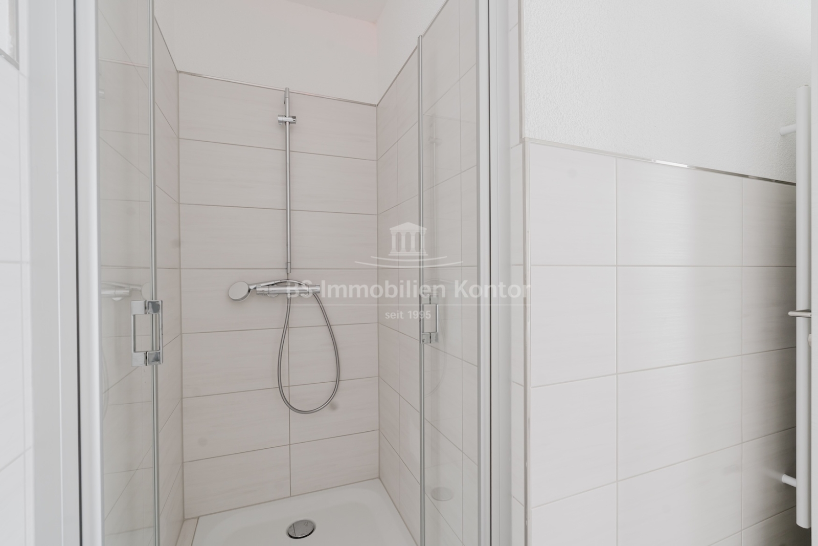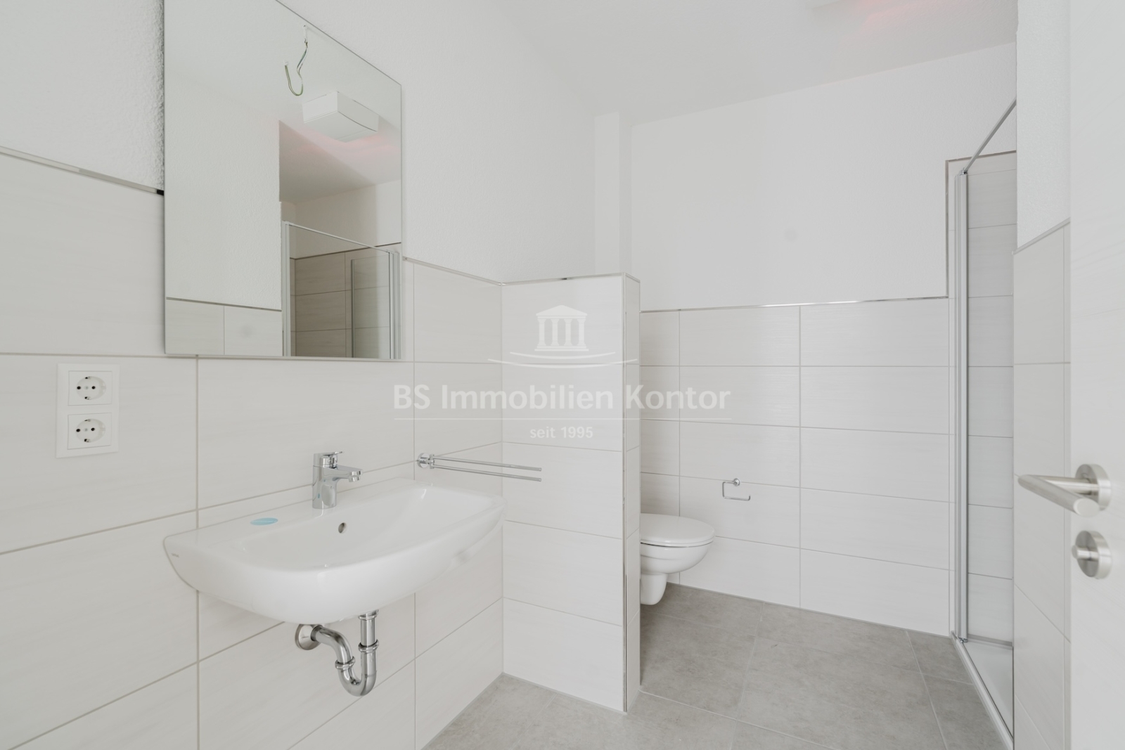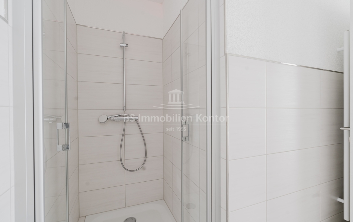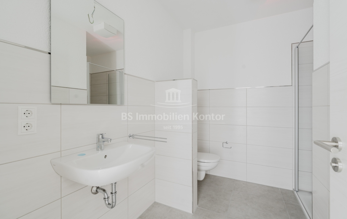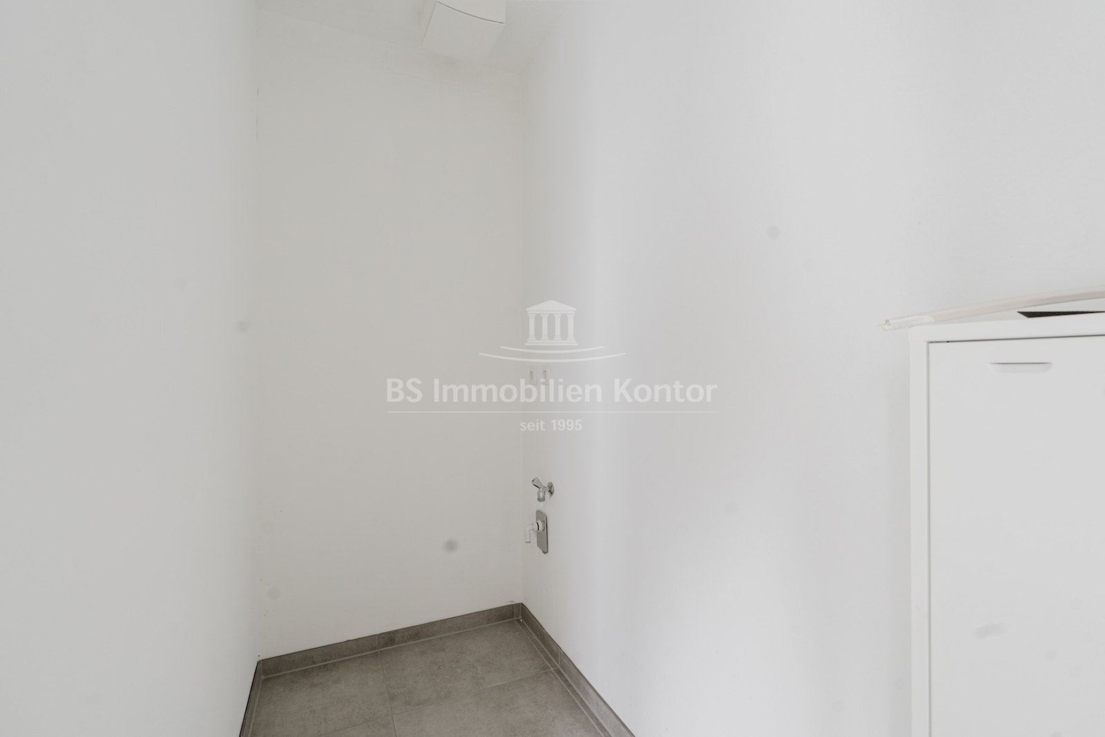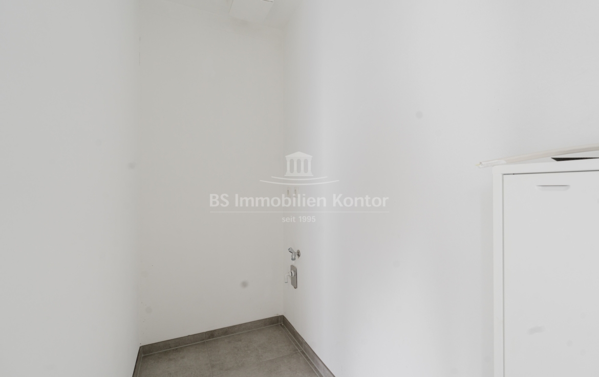 Das Schlafzimmer bietet ausreichend Platz für ein Doppelbett und Stauraum. Das moderne Badezimmer ist mit einer bodengleichen Dusche, einem Waschbecken und einem WC ausgestattet. Ein separater Hauswirtschaftsraum (HWR) mit Anschluss für Waschmaschine und Trockner sorgt für zusätzlichen Komfort.