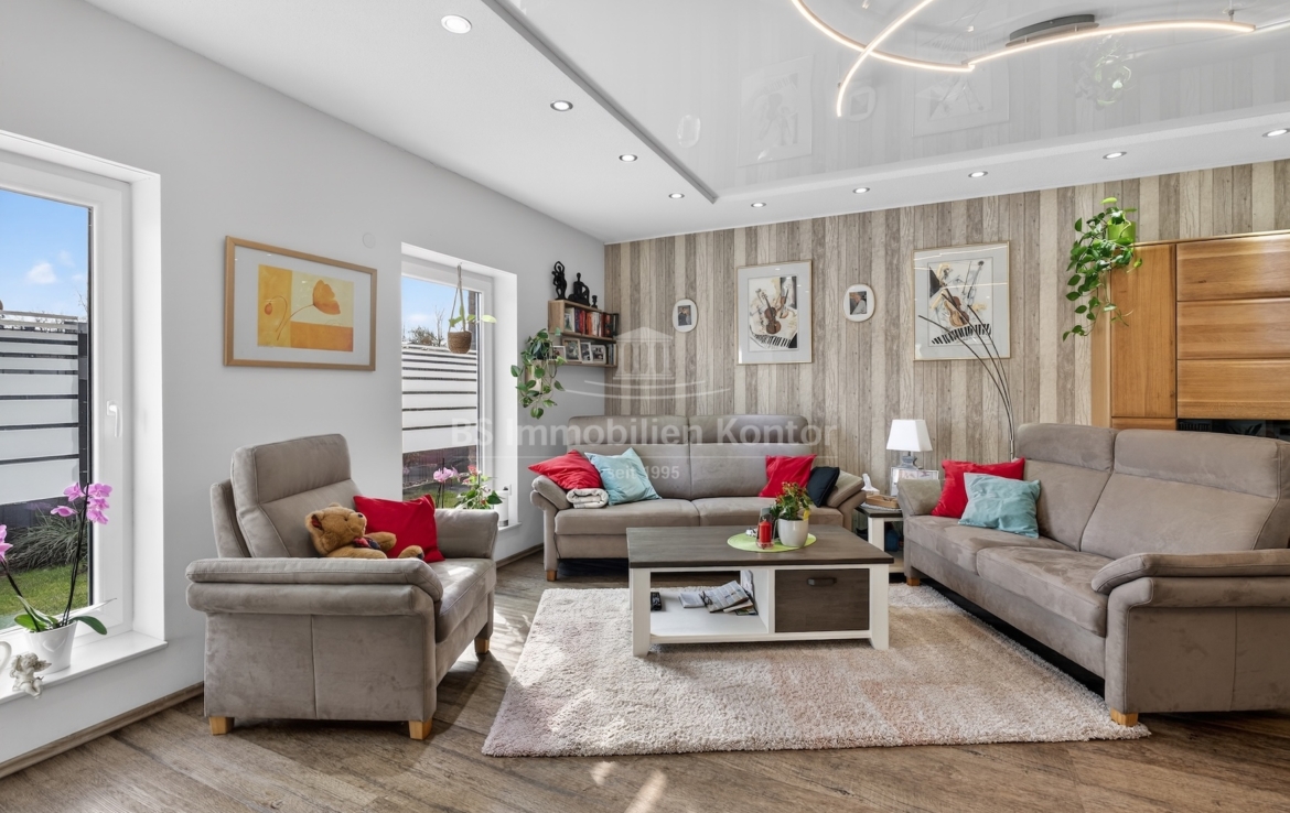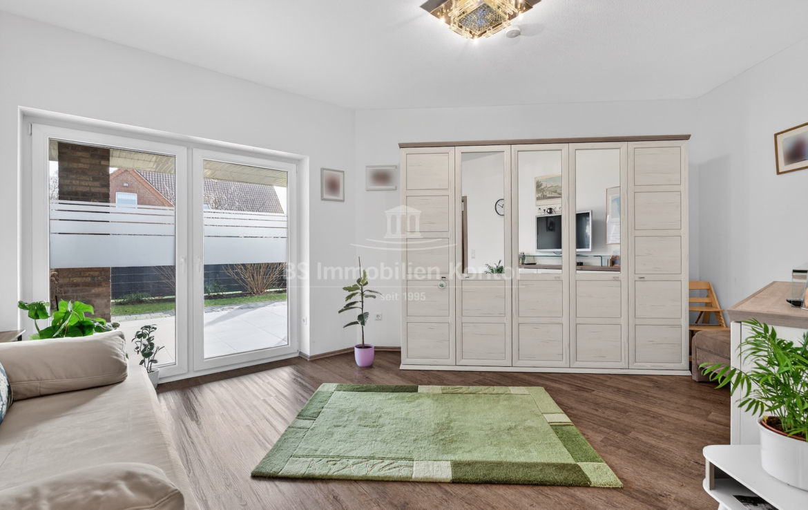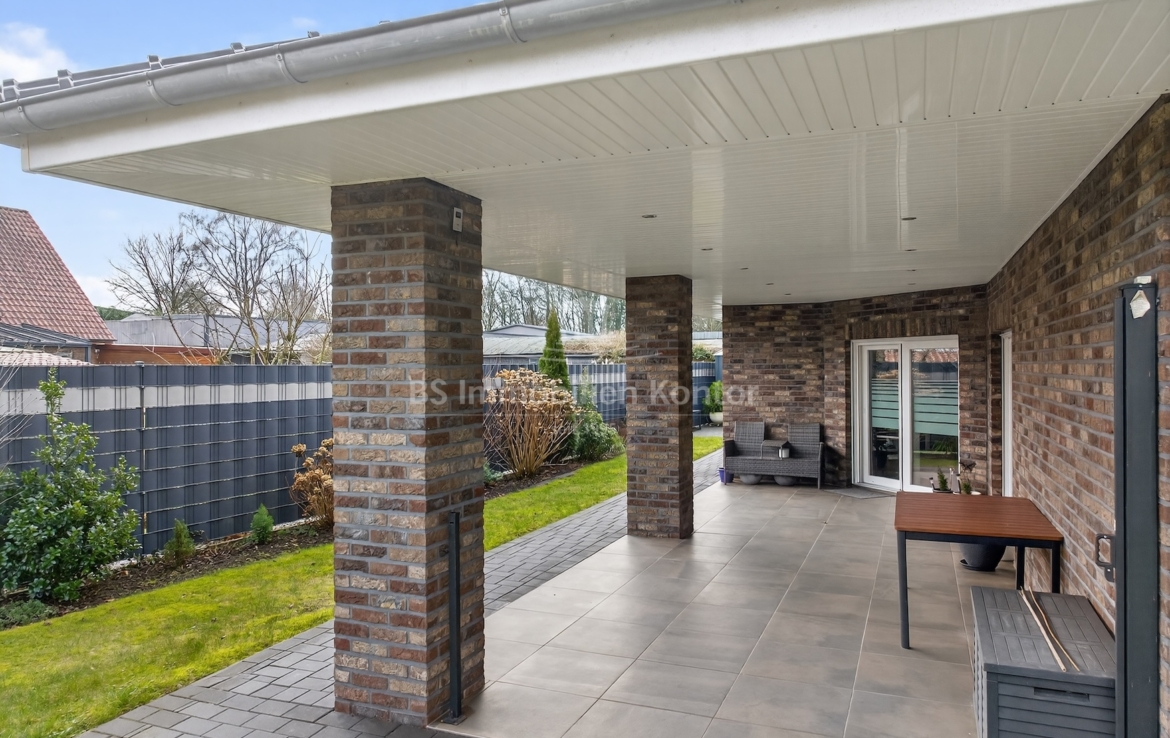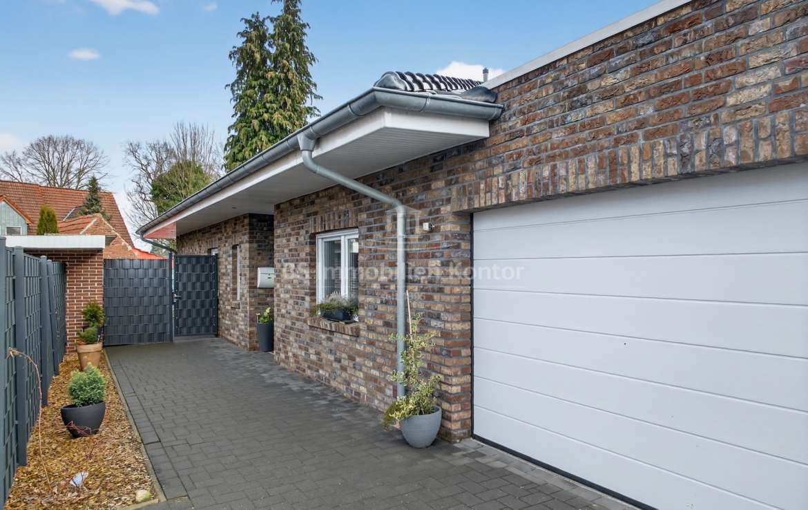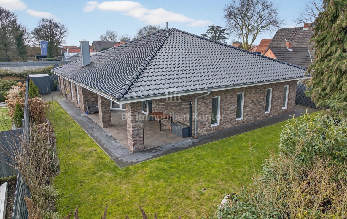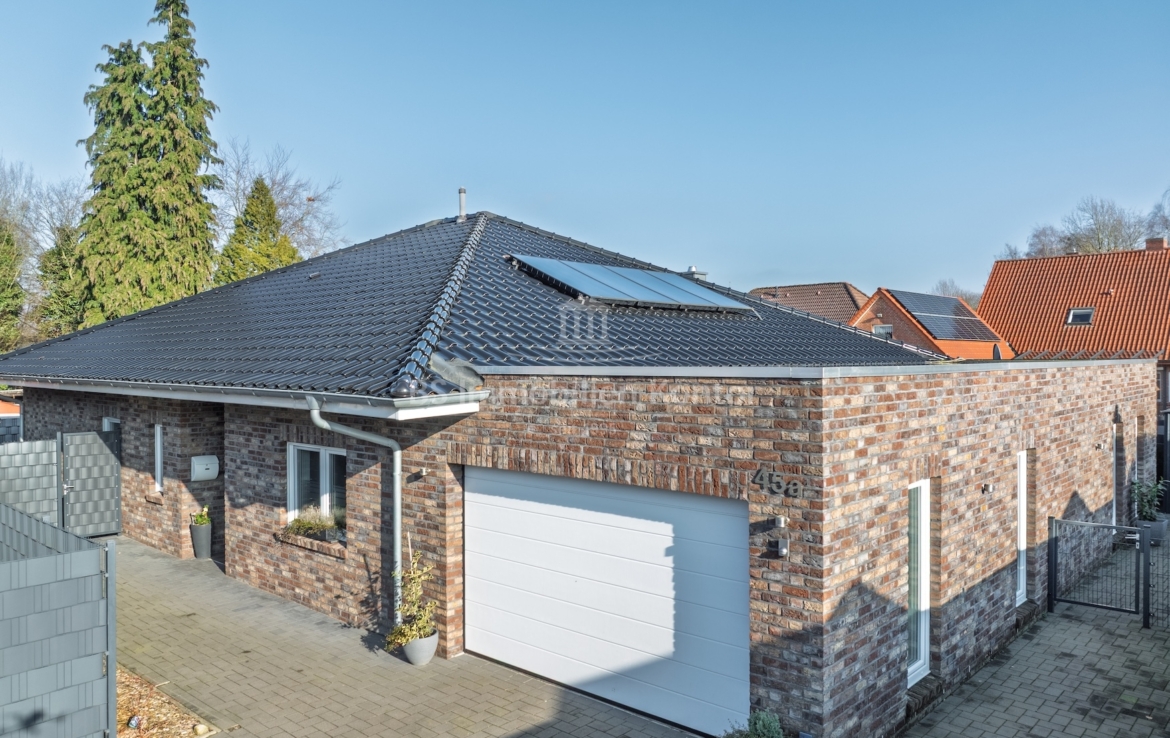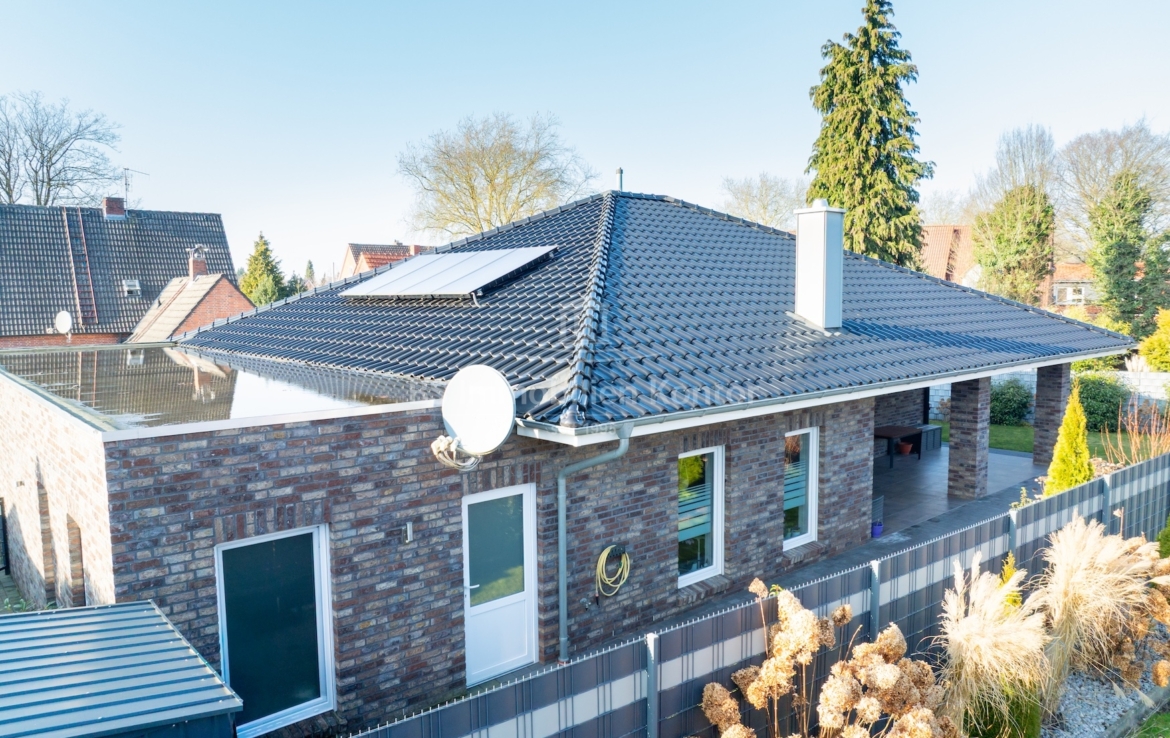 Dieser moderne und gepflegte Bungalow aus dem Baujahr 2016 befindet sich in ruhiger Wohnlage von Papenburg, in zweiter Reihe auf einem ca. 589 m² großen Grundstück. Die Immobilie überzeugt durch eine durchdachte Raumaufteilung sowie eine hochwertige und zeitgemäße Ausstattung. Drei Schlafzimmer sowie ein separates Gäste-WC gehen direkt vom Flur ab. Das Herzstück des Hauses bildet die offene Wohnküche mit angrenzendem Wohnbereich. Ein Kaminofen sorgt hier für eine besonders behagliche Wohnatmosphäre und lädt zum Verweilen ein. Das großzügige Badezimmer ist modern ausgestattet und verfügt über eine Badewanne, eine Dusche, zwei Waschbecken sowie ein WC. Ein praktischer Hauswirtschaftsraum bietet zusätzlichen Stauraum und ermöglicht einen direkten Zugang zur Garage. Vom Wohnbereich aus gelangt man auf die große, überdachte Terrasse, die viel Platz bietet und zum Verweilen im Freien einlädt. Die dreifach verglasten Fenster, elektrischen Jalousien sowie die im gesamten Haus verlegte Fußbodenheizung sorgen für hohen Wohnkomfort. Die breiten Türen unterstreichen den modernen Charakter des Hauses. In der Garage ist eine Wallbox für Elektrofahrzeuge installiert, ergänzt durch eine separaten Abstellraum. Auf dem Dach befinden sich Warmwasserkollektoren, die zur Unterstützung der Warmwasseraufbereitung beitragen und die Energieeffizienz des Hauses zusätzlich verbessern. Eine Immobilie für Menschen, die Wert auf Komfort und Qualität legen: Moderner Bungalow mit Terrasse und Garage in Papenburg bietet durchdachte Räume, hochwertige Ausstattung und eine ruhige Lage – ideal für entspanntes Wohnen.