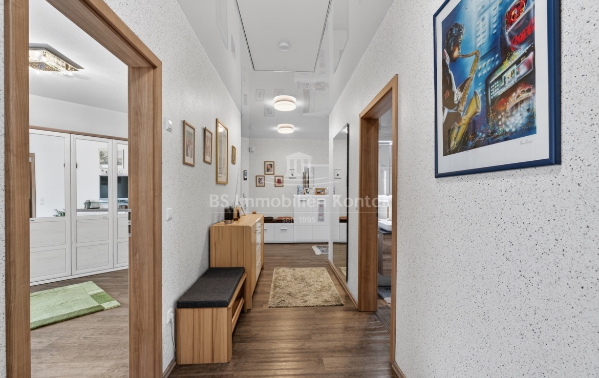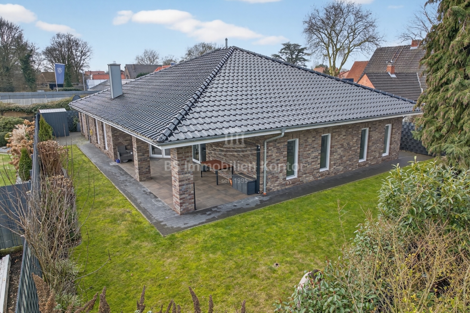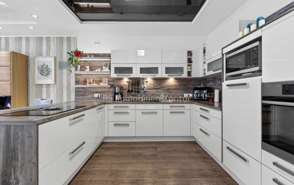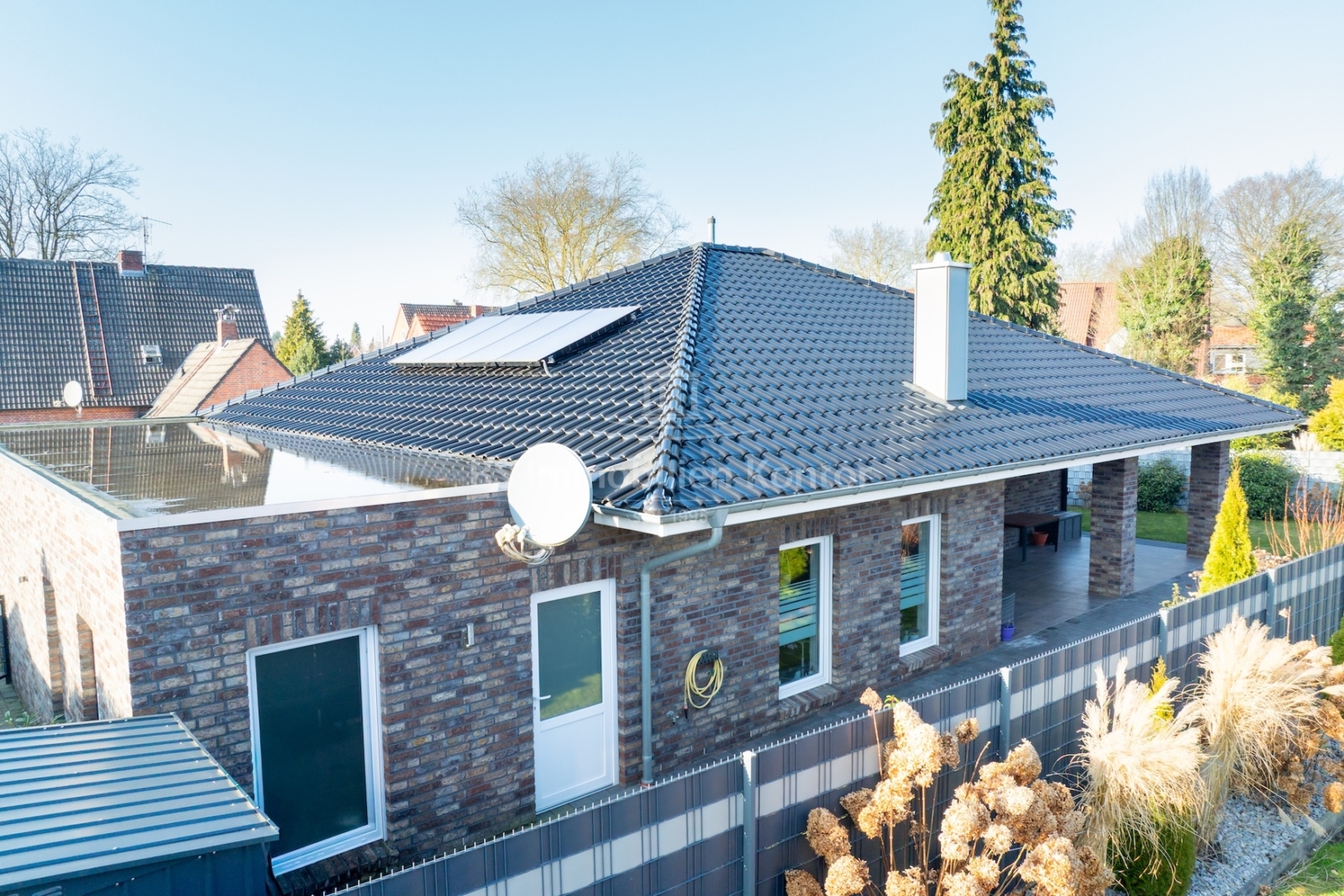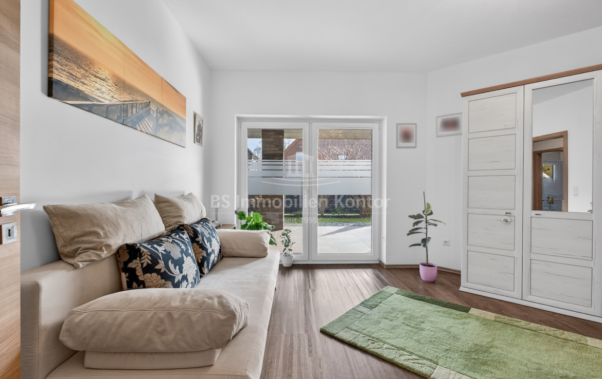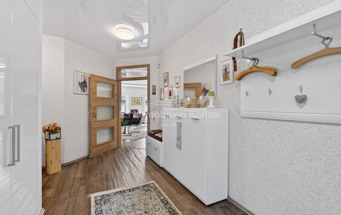 Dieser moderne und gepflegte Bungalow aus dem Baujahr 2016 befindet sich in ruhiger Wohnlage von Papenburg, in zweiter Reihe auf einem ca. 589 m² großen Grundstück. Die Immobilie überzeugt durch eine durchdachte Raumaufteilung sowie eine hochwertige und zeitgemäße Ausstattung. Drei Schlafzimmer sowie ein separates Gäste-WC gehen direkt vom Flur ab. Das Herzstück des Hauses bildet die offene Wohnküche mit angrenzendem Wohnbereich. Ein Kaminofen sorgt hier für eine besonders behagliche Wohnatmosphäre und lädt zum Verweilen ein. Das großzügige Badezimmer ist modern ausgestattet und verfügt über eine Badewanne, eine Dusche, zwei Waschbecken sowie ein WC. Ein praktischer Hauswirtschaftsraum bietet zusätzlichen Stauraum und ermöglicht einen direkten Zugang zur Garage. Vom Wohnbereich aus gelangt man auf die große, überdachte Terrasse, die viel Platz bietet und zum Verweilen im Freien einlädt. Die dreifach verglasten Fenster, elektrischen Jalousien sowie die im gesamten Haus verlegte Fußbodenheizung sorgen für hohen Wohnkomfort. Die breiten Türen unterstreichen den modernen Charakter des Hauses. In der Garage ist eine Wallbox für Elektrofahrzeuge installiert, ergänzt durch eine separaten Abstellraum. Auf dem Dach befinden sich Warmwasserkollektoren, die zur Unterstützung der Warmwasseraufbereitung beitragen und die Energieeffizienz des Hauses zusätzlich verbessern. Eine Immobilie für Menschen, die Wert auf Komfort und Qualität legen: Moderner Bungalow mit Terrasse und Garage in Papenburg bietet durchdachte Räume, hochwertige Ausstattung und eine ruhige Lage – ideal für entspanntes Wohnen.