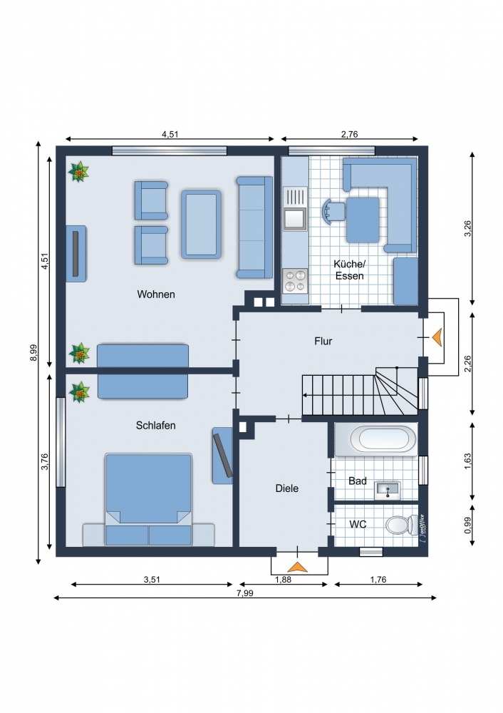 EG: Flur/Diele, Wohnküche, Wohnzimmer, Elternschlafzimmer, Duschbad, WC