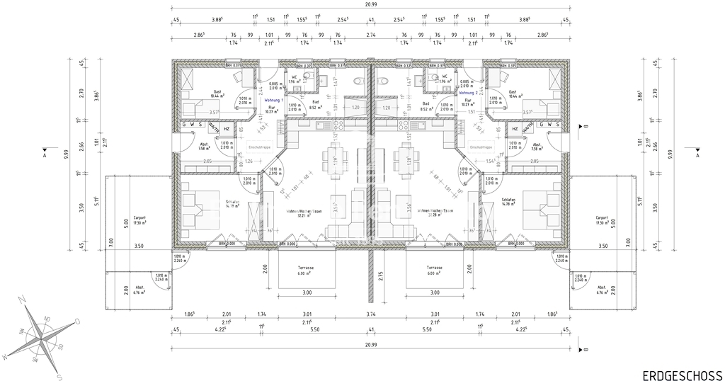 EG: Flur/Diele, Gäste WC, Duschbad mit WC, Gästezimmer, HWR, offener Wohn-/Essbereich mit Küchenanschlüssen und Zugang zur Terrasse, Abstellraum, Schlafzimmer