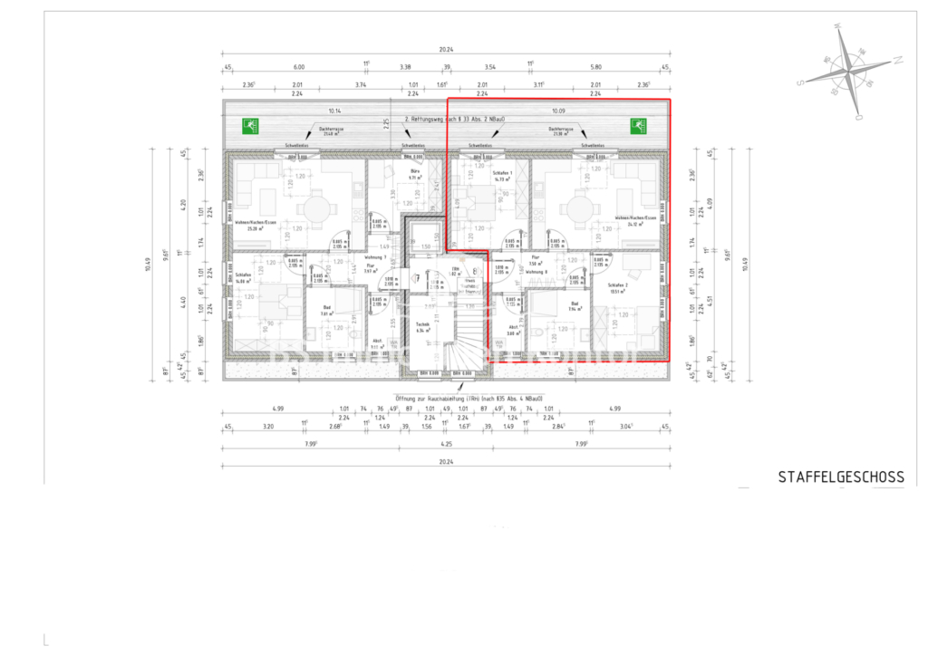 Gebäude: DG: Flur/Diele, Duschbad mit WC, Gästezimmer, Schlafzimmer, offener Wohn-/Essbereich mit Küchenanschlüssen und Zugang zur Dachterrasse, Abstellraum mit Anschluss für WA/TR,