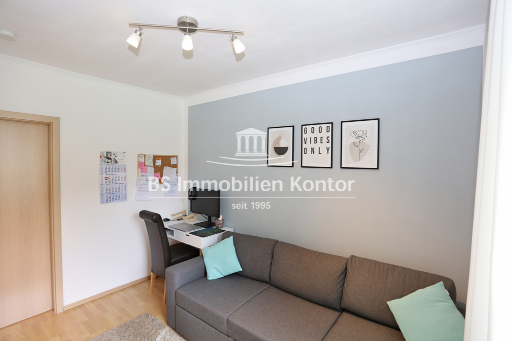 EG: Flur/Diele, Küche, Duschbad mit WC, Büro, Abstellraum, Wohnzimmer mit Zugang zum Balkon,