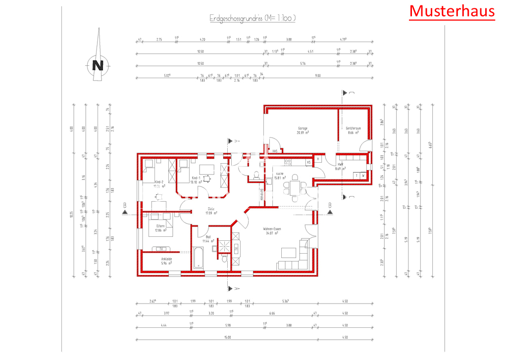 EG: Flur/Diele, Gäste WC, 2x Kinderzimmer, Elternschlafzimmer mit Ankleide, Bad, offener Wohn-/Essbereich mit Küchenanschlüssen, HWR, Garage/Carport, Geräte
