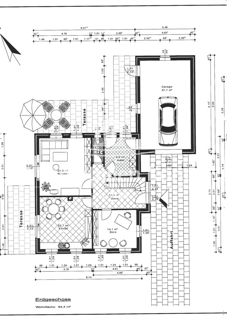 Gebäude: EG: Flur/Diele, Büro, Wohnküche mit Zugang zur Terrasse, Wohnzimmer mit Ofen und Zugang zur Terrasse, Gäste-WC, HWR mit Zugang nach draußen und in die Garage
