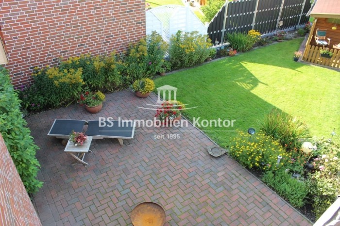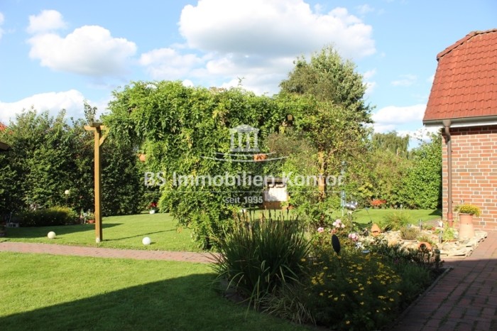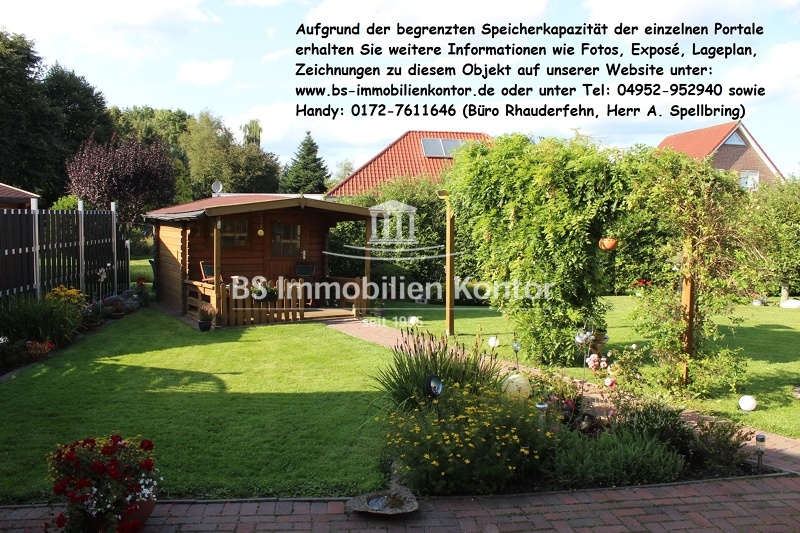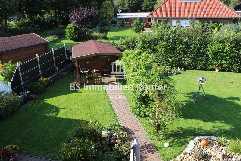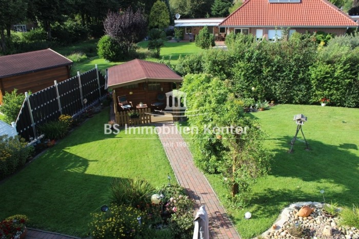 ca. 737 m² (angelegter Garten, rückw. teilw. nicht einsehbar mit Rasenflächen/Ziersträuchern , Terrasse, massives Blockhaus und großzügiger Hofauffahrt)
