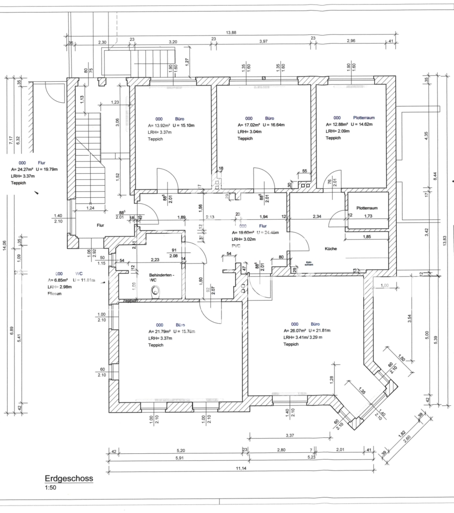 EG:Treppenhaus, Flur, 5x Büroraum, Abstellraum, WC