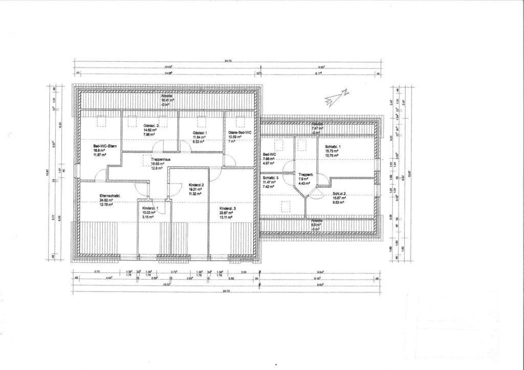 OG: Hauptwohnung: Flur/Diele, Elternschlafzimmer mit Bad en Suite 3x Kinderzimmer, Gäste-Duschbad, ca. 73qm
