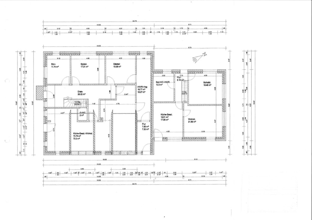 EG: Hauptwohnung: Flur/Diele, Gäste-WC, offener Wohn-/Essbereich mit Küche und Kaminofen, HWR, Büro, 2x Gästezimmer ca. 168qm