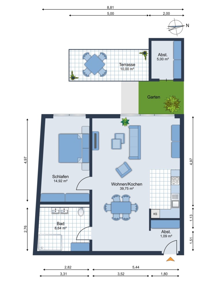 EG: Flur/Diele, offener Wohn-/Essbereich mit Küchenanschlüssen und Zugang zur Terrasse, Schlafzimmer, Duschbad mit WC, zzgl. Sep. Abstellraum im EG