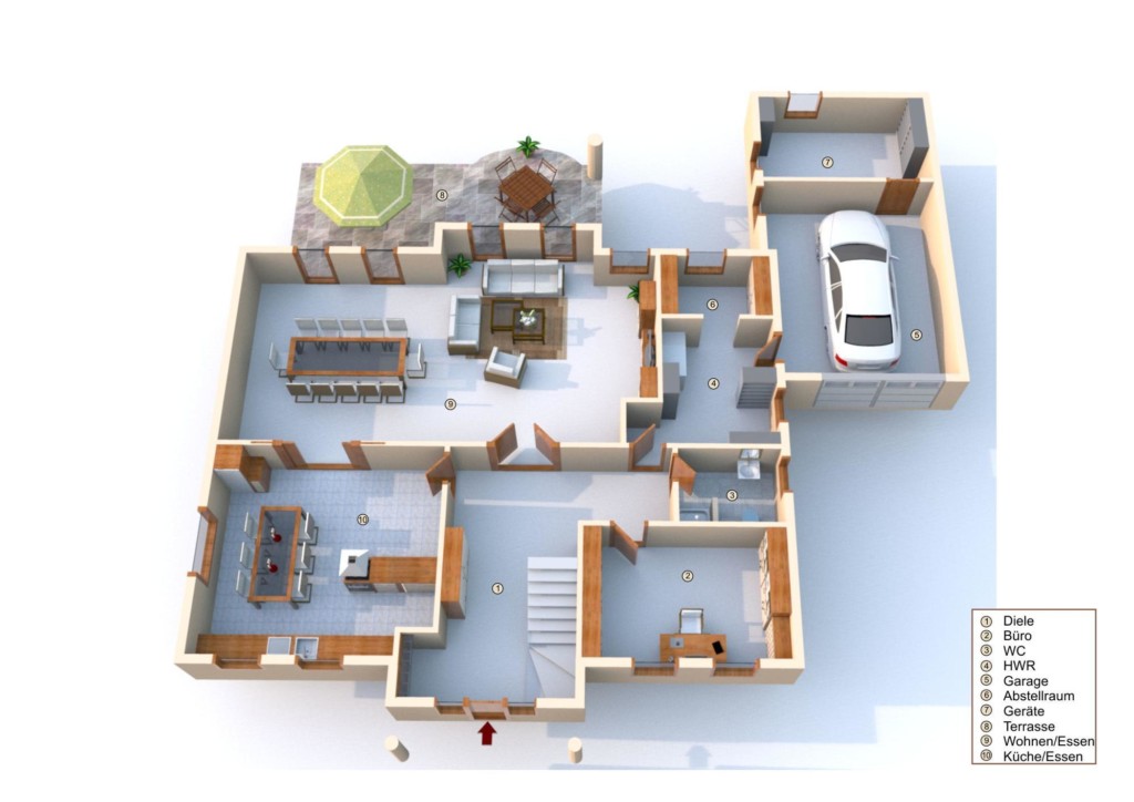 EG: Flur/Diele mit Galerie, großer, offener Wohn-/Essbereich mit Kaminofen, Wohnküche mit Schiebeelement, Duschbad mit WC, Büro/Gästezimmer mit Einbauschränken, HWR mit Zugang zur Garage