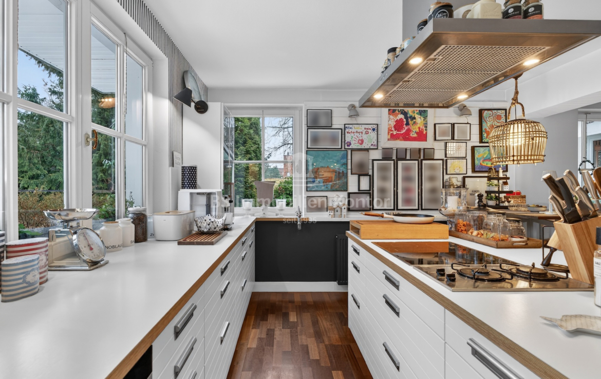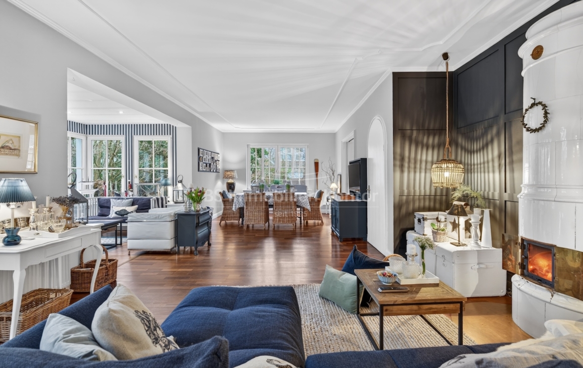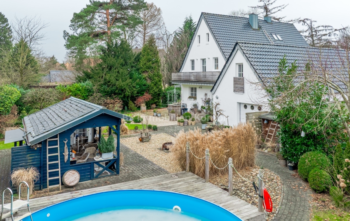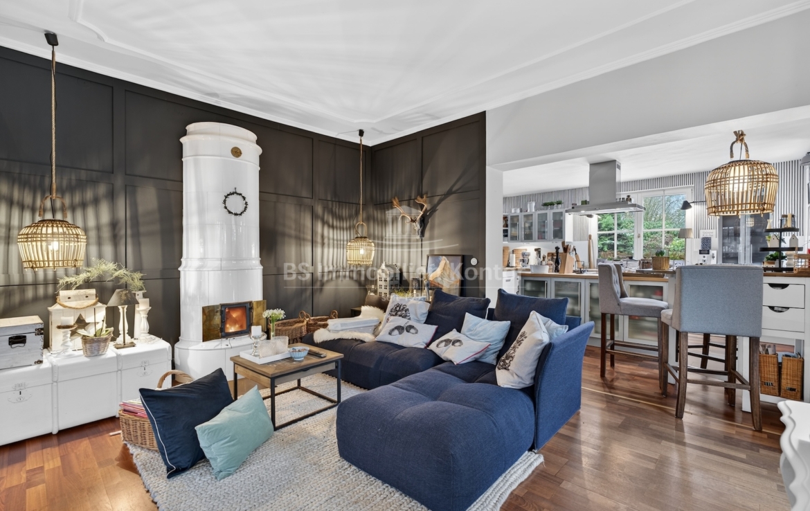 Diese außergewöhnliche Immobilie vereint auf harmonische Weise klassischen Charme mit modernem Wohnkomfort. Zum Anwesen gehört ein 1.251 m² großes Grundstück mit überdachter Terrasse, Gartenhaus, Pool mit Wärmepumpe und Doppelgarage. Schon beim Betreten des Hauses durch den separaten, großzügigen Windfang, gelangen Sie ins repräsentative Entrée: Der helle Flur besticht durch sein stilvolles Echtholzparkett, Rundbogentüren sowie eine elegante, geschwungene Holztreppe, die als architektonisches Highlight ins Obergeschoss führt. Das Herzstück des Hauses bildet der offene Wohn- und Lebensbereich. Hier sorgt ein imposanter Kachelofen (Mittelschweden um 1900) vor einer dunklen Akzentwand für gemütliche Wärme und eine unvergleichliche Atmosphäre. Mit seinem charmanten Erker als Rückzugsort und dem Essbereich bleiben hier keine Wohnwünsche offen. Die angrenzende Küche mit Kochinsel bietet viel Stauraum und ist der perfekte Ort für gesellige Kochabende. Das angegliederte Büro lässt sich dank einer Schiebewand nahtlos in den Wohnbereich integrieren oder abtrennen. Ein Gäste-WC und ein Abstellraum und eine kleine Werkstatt runden das Erdgeschoss ab. Im Obergeschoss setzt sich der Wohlfühl-Faktor fort. Hohe Decken, Dielenböden und Echtholzparkett prägen das Ambiente dieser Etage. Diese Etage überzeugt mit vier Schlafräumen. Ein besonderes Highlight sind die zwei Zimmer mit Balkonzugang – eines davon verfügt zusätzlich über eine eigene Treppe direkt zum Hochbett im Dachboden. Das Vollbad und der praktische Waschraum vervollständigen das Raumangebot auf dieser Ebene. Der Zugang zum Dachgeschoss (Spitzboden) erfolgt über eine hochwertige Holztreppe. Das Platzangebot dieses Anwesens wird durch ein praktisches Nebengebäude direkt am Haus ergänzt. Es umfasst eine Doppelgarage, die dank eines zweiten Rolltores die Durchfahrt in den Garten ermöglicht. Darüber befindet sich ebenfalls ein Spitzboden. Ergänzende Abstellmöglichkeiten bietet zudem ein Teilkeller und ein weiterer Raum welcher vom Garten aus begehbar ist.