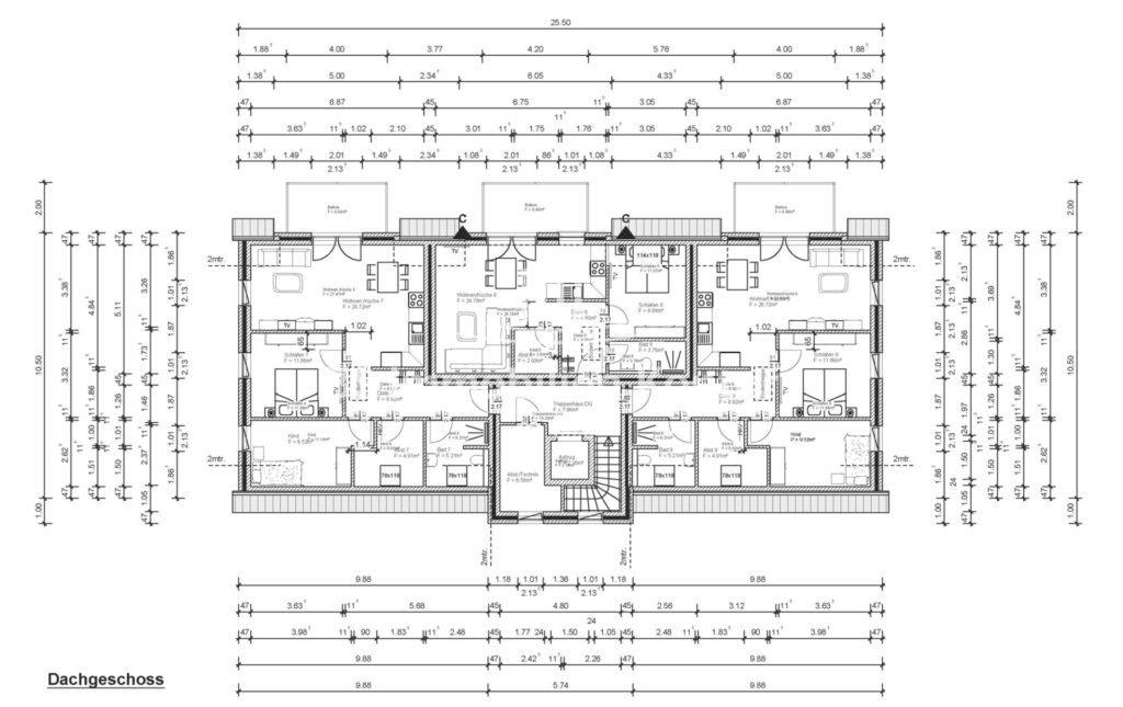 Gebäude: DG: Flur/Diele, Duschbad mit WC, Abstellraum, Kinderzimmer, Schlafzimmer, offener Wohn-/Essbereich mit Küchenanschlüssen und Zugang zum Balkon