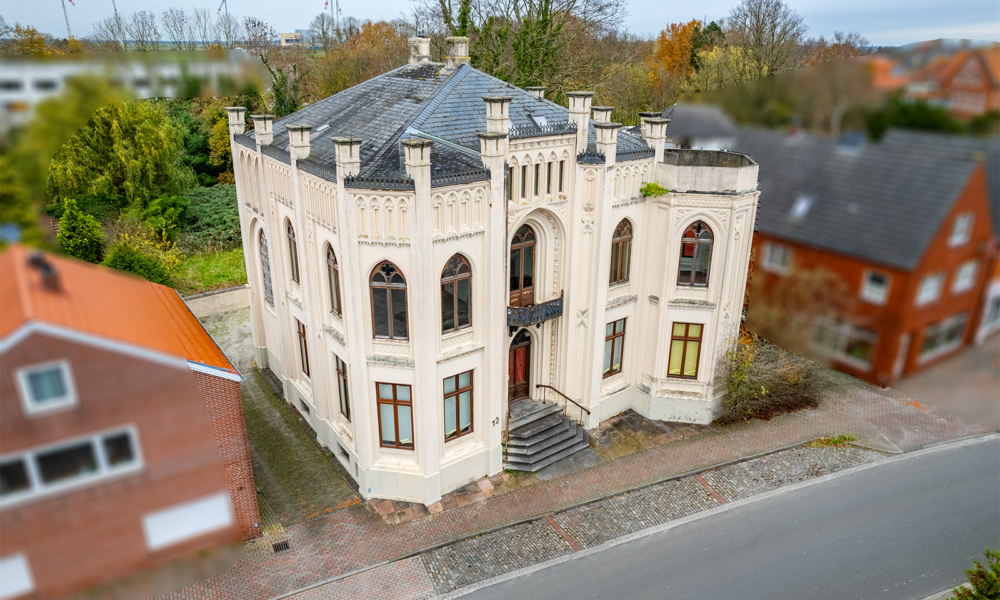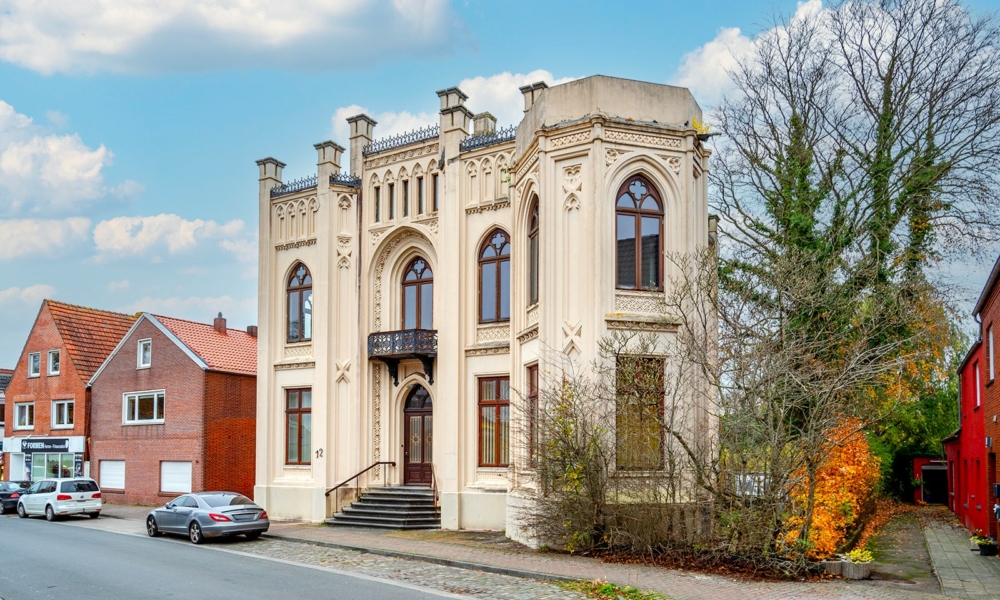 Diese Stadtvilla wurde im Jahre 1861 im neugotischen Architekturstil erbaut und besticht noch heute als Einzeldenkmal mit seinen detailreichen Formelementen und ausgeprägten Drempeln als architektonischer Zeitzeuge. In einer zentralen und exponierten Lage von Weener steht der zweigeschossige Putzbau auf einem Grundstück von von 2.272 qm. Die Eigentümer beauftragten den Immobilienmakler Dennis Büürma (Büro Emden) mit dem Verkauf dieser besonderen Immobilie. Hervorzuheben ist ein turmartiger Parterreerker, die hohen Fenster sowie die vielen Giebel, die dieser Immobilie ihren Charme verleihen. Zusätzlich beleben die ausgeprägten Risalite das äußere Erscheinungsbild dieser Villa. Das Gebäude bietet eine Wohnfläche von ca. 510 qm, ist komplett unterkellert und hält neben Technik-, Wasch- und Heizungsraum genügend Räume als Abstellmöglichkeit bereit. Vielen Personen ist diese Immobilie auch als „Villa Bärchen“ bekannt. Der Name ist auf Herrn Bärchen aus Berlin zurückzuführen, der in den 1960er Jahren in diesem Gebäude eine Baskenmützenfabrik betrieb. Zuletzt wurde das Gebäude als Wohnung und Praxis genutzt. Beim Betreten der Villa präsentiert sich die geräumige Eingangshalle und die prägnante Treppe mit ihrem kunstvollen Treppenlauf und versetzt den Betrachter in eine andere architektonische Zeitepoche. Beheizt wird die Immobilie durch eine Gas-Zentralheizung. Die Türen und Oberlichtfenster aus Massivholz zeugen von der Verarbeitung hochwertiger Baumaterialien. Die vielseitige Verwendbarkeit dieses Anwesens ermöglicht die Umsetzung unterschiedlichster Wohnträume, um Lebensqualität in einem Gebäude mit Alleinstellungsmerkmal umzusetzen.